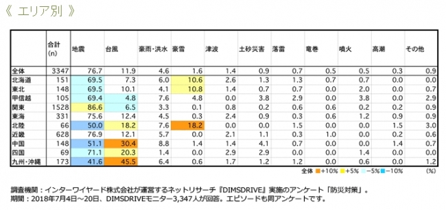 一方で、「地震」の数値が「九州・沖縄」に次いで低かったのが、「中国」51.1%、「北陸」50.0%です。「中国」は、「豪雨・洪水」が全エリア中最も高く、8.8%。このアンケートの回答時期が、ちょうど平成30年7月豪雨と近かったことも影響しているかもしれません。