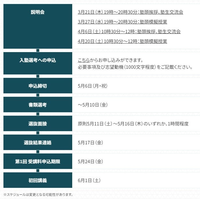 3月21日(木)、3月27日(水)、4月6日(土)、4月20日(土)には、塾頭 朝比奈による模擬授業・塾生交流会も