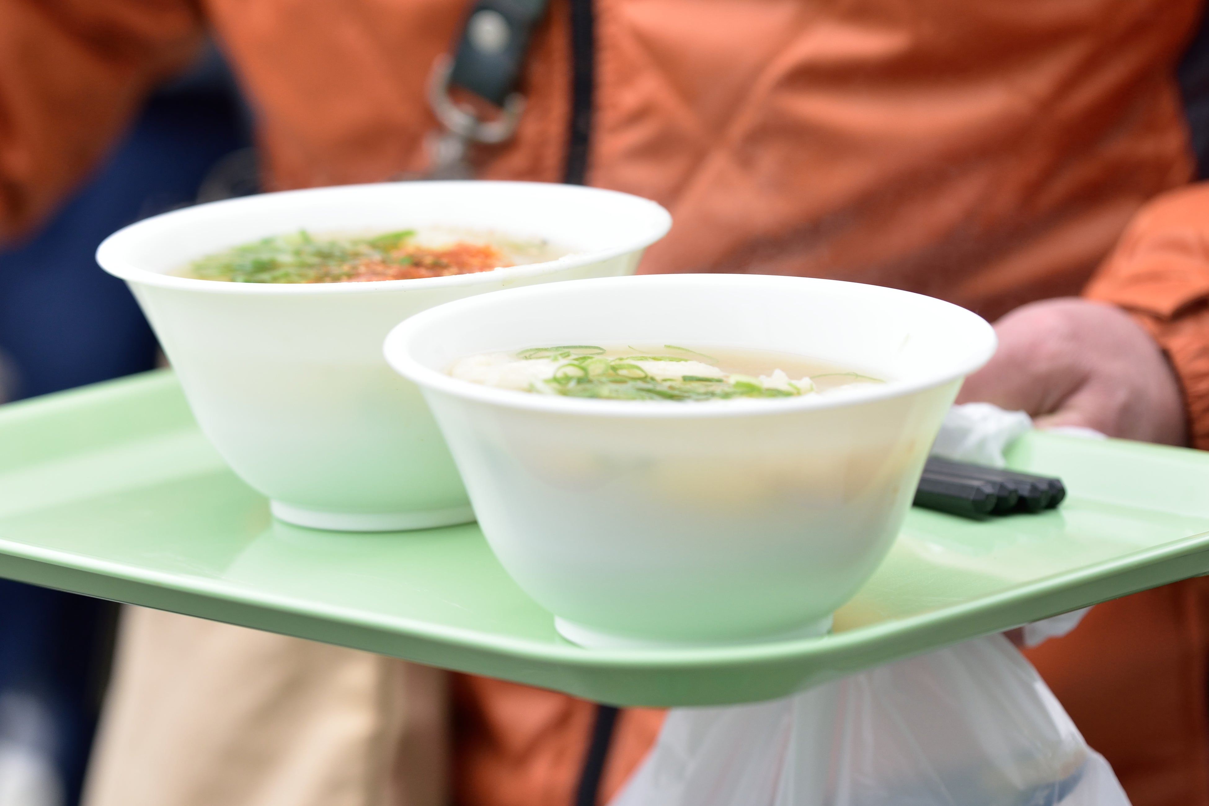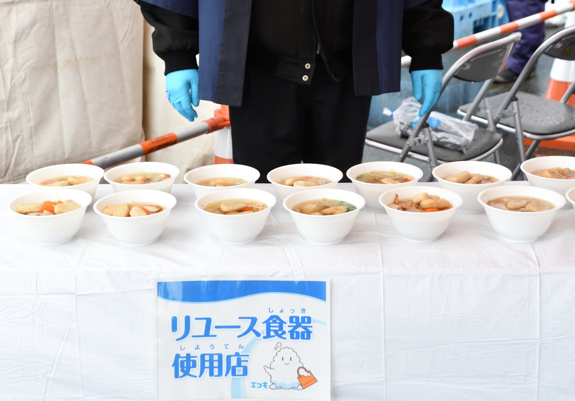 弊社が行う介護事業部の福祉用具レンタル事業のノウハウを活かして、地域で行うお祭りやイベントなどで使用する使い捨て容器に替えて、プラスティック製のコップや皿、どんぶりなど12種類の容器を使用していただくのがリユース食器レンタル事業です。イベント開催者へ容器の貸し出しを行い、使用後にそのまま返却していただきます。そのため、大幅なゴミ削減となり、非常にエコで環境負荷の少ない食器です。島根県内では唯一、弊社がリユース食器レンタル事業を行っております。