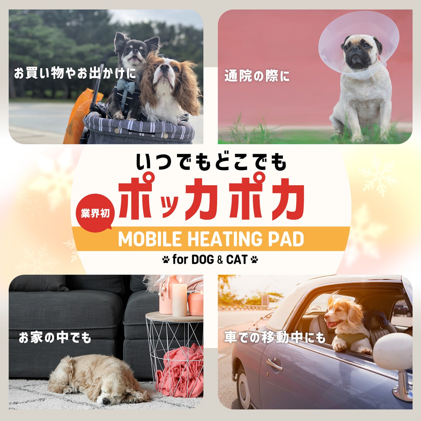 冬の季節、どうしても愛犬、愛猫と出掛けないとならない場面、そんな時に体温通院先の病院や外出先でもキャリーの中での温度調整を行う事が出来るよう、キャリーの中に入れて使える専用のホットカーペットを開発しました。
