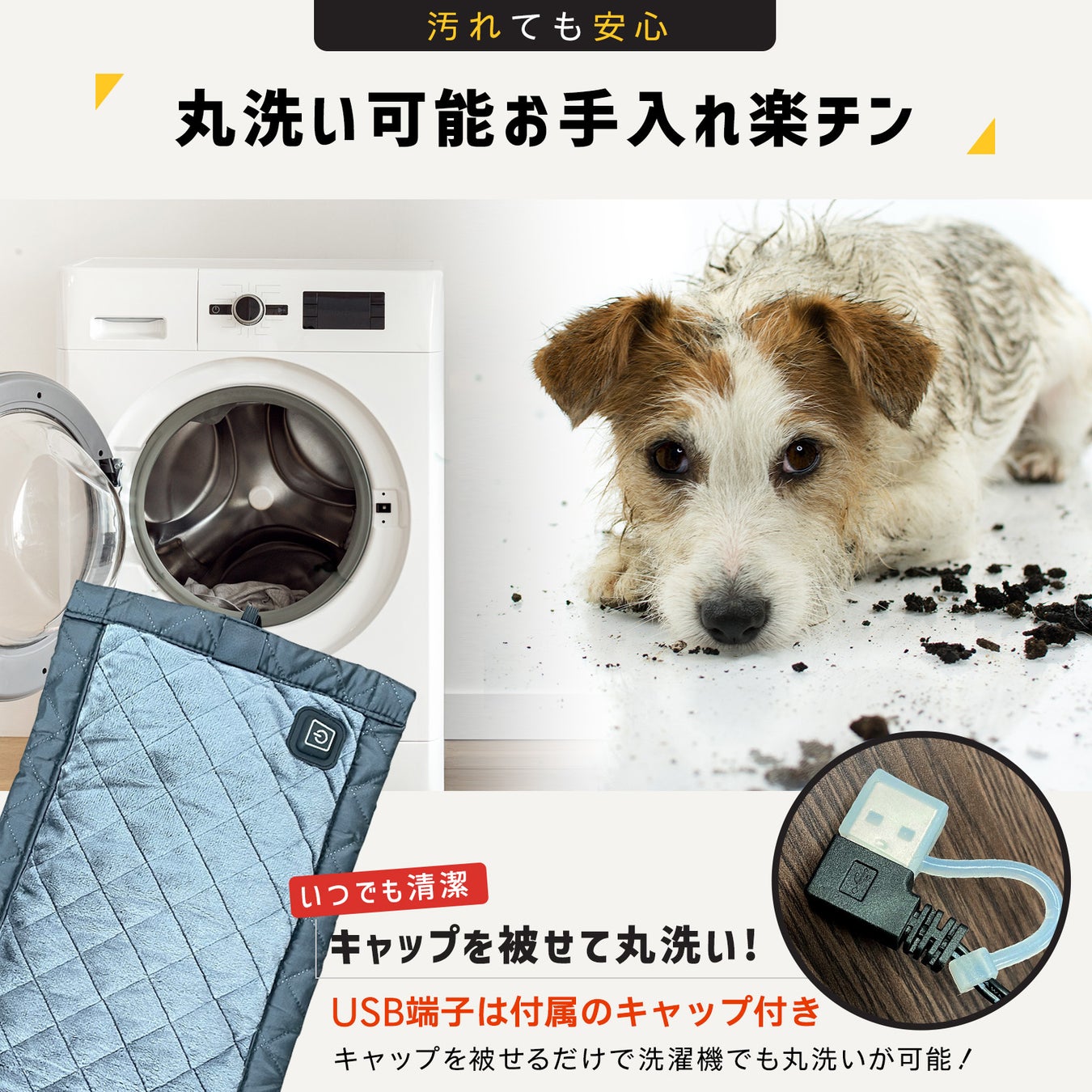 USB端子に付属のキャップがついているので被せるだけで洗濯機でも丸洗いが可能です。