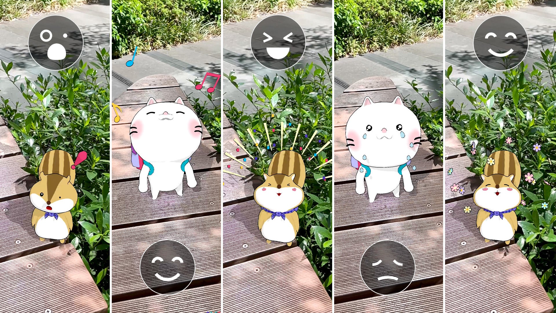 ポケットとシュガーは「表情ボタン」で表情に合ったオブジェクトが出現する仕様になっています。楽しい表情ボタンで花が出現したり、驚いた表情でびっくりマークが出現するなど、これまであまりなかったAVATAVI表現をお楽しみいただけます。