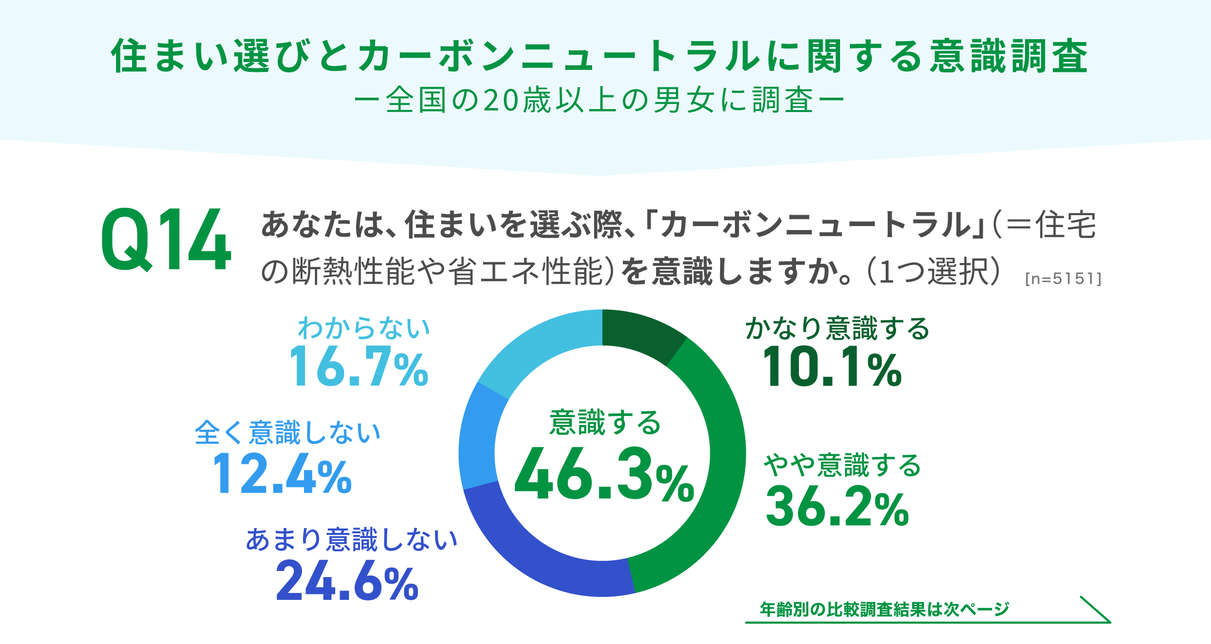 Q14. あなたは、住まいを選ぶ際、「カーボンニュートラル」(=住宅の断熱性能や省エネ性能)を意識しますか。(1つ選択)(n=5151)