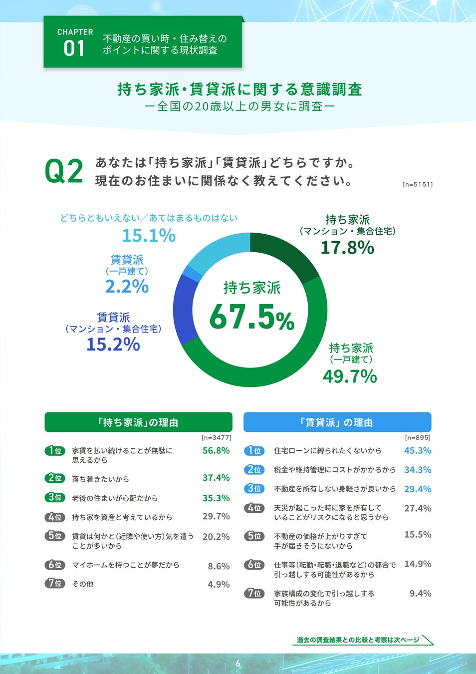 不動産の「買い時だと思う」人15.8%、昨年と比べ9.4pt増加。「持ち家派」67.5%(-10.4pt)、空き家問題に関する現状「既に空き家になっているまたは空き家の可能性」が35.0%に