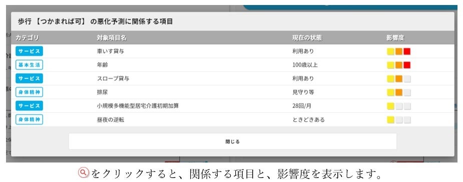 これによって、ケアマネジャーの皆様が、特定の状態の悪化予想に関連する項目から、状態像の相関関係、因果関係を検討しやすくなり、利用者の方々に対してより改善に寄与するケアプラン作成を手助けできるようになります。