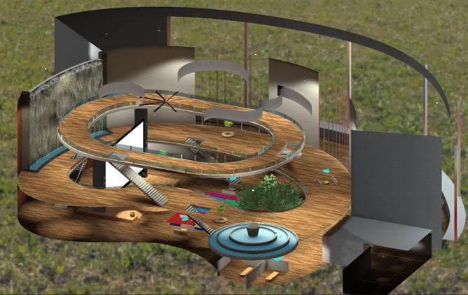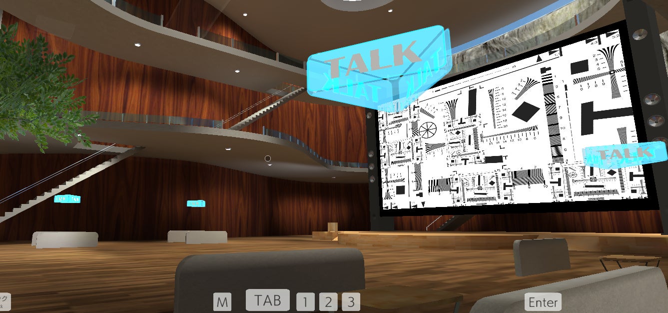 本会場は、数百名以上が参加し、主にスクリーンを用いた講演・発表などのイベントに最適化された初のデフォルト会場となります。ライブ配信対応の巨大スクリーンや、より位置がわかりやすくなった通話ゾーンなど基本機能はもちろん、3層構造の会場内の複数箇所に配置されたカメラマン向け透明足場、クイズ大会モードへの切り替えなど、これまでにない試みも盛り込まれた会場となっております。