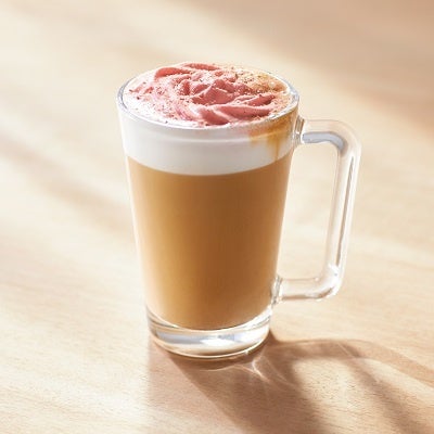 伝統と歴史への敬意、未来への決意を表すコーヒー、「グラビタス ブレンド®」にチョコレートシロップをあわせ、トッピングにストロベリークリームをあしらった、スムーズでやわらかい口当たりが特長のビバレッジ。風に舞う満開の桜をイメージした、この時期ならではのビバレッジ。