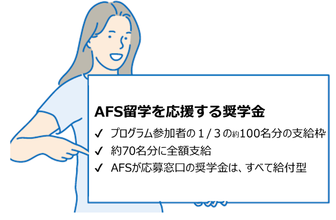 AFSには、より多くの高校生に留学機会を提供したいと願う多くの個人、法人、団体からの寄付・助成により、さまざまな奨学金が用意されています。
