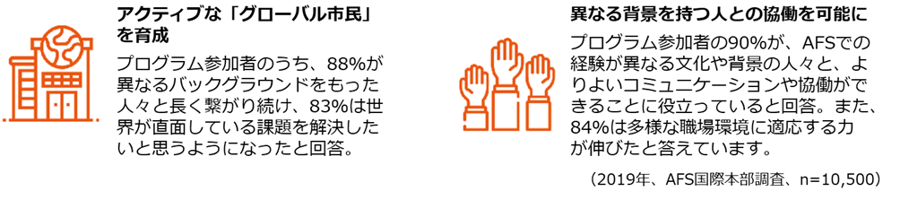 AFSのプログラムは、視野を広げ、違いを学び尊重し、文化の垣根を越えて協働する力を養うこと、またそれによって、公正で平和な社会のために前向きな変化を生み出すことを目的としています。2019年にAFS国際本部が日本を含む80か国・10,500人のAFS帰国生を対象に実施した調査では、参加者の9割が、AFSでの経験が異なる背景を持つ人と協働することに役立ったと回答しています。
