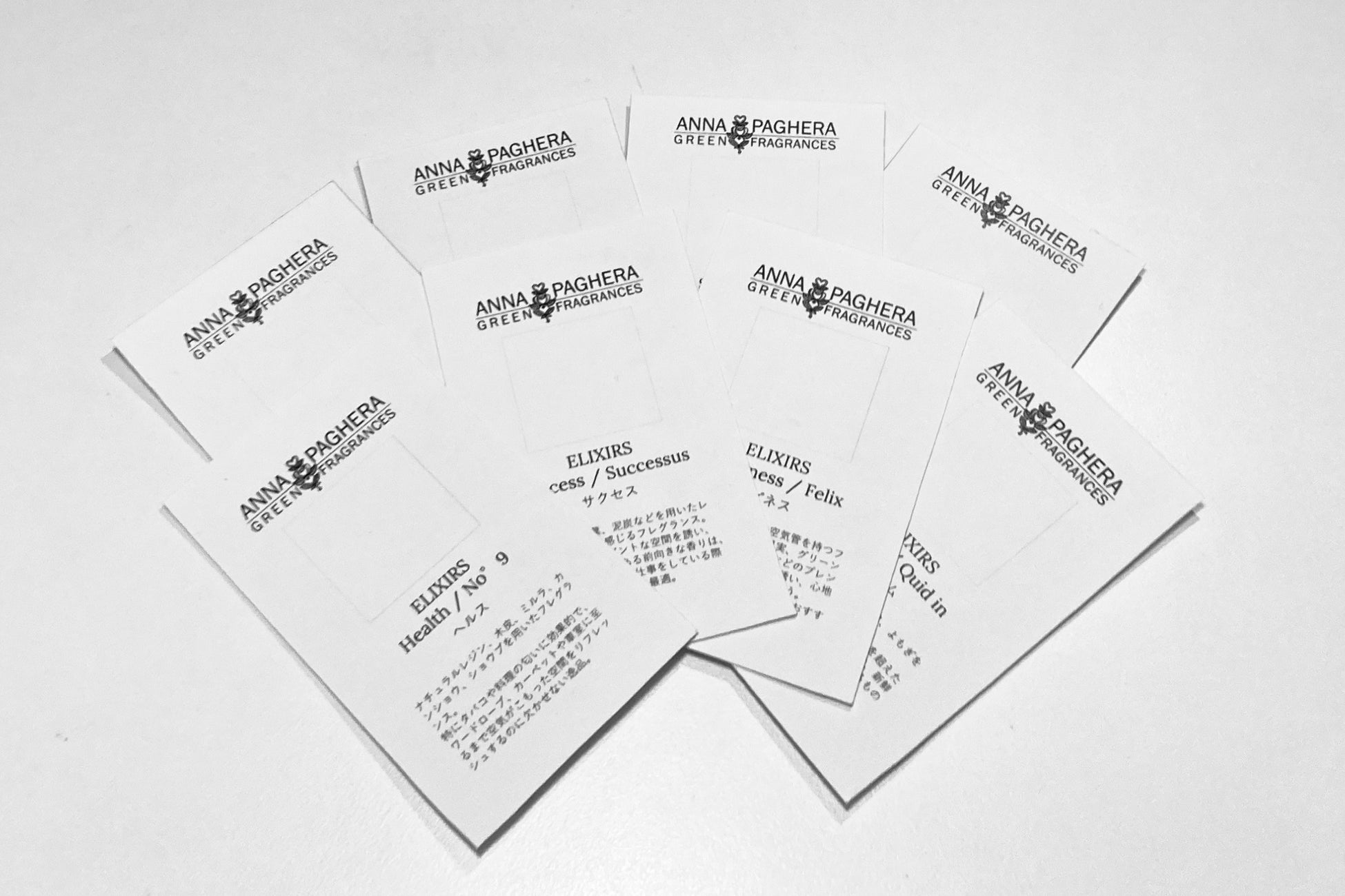 アンナ・パゲラの香りをお試ししたい方へ、香りのサンプルとして各種香りをつけた紙材(ムエット)のセットを期間限定で無料でお送りいたしますので、ご自宅にいながら簡単にお気に入りの香りを見つけていただくことができます。