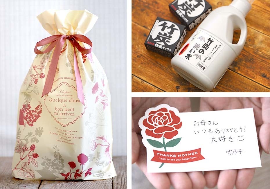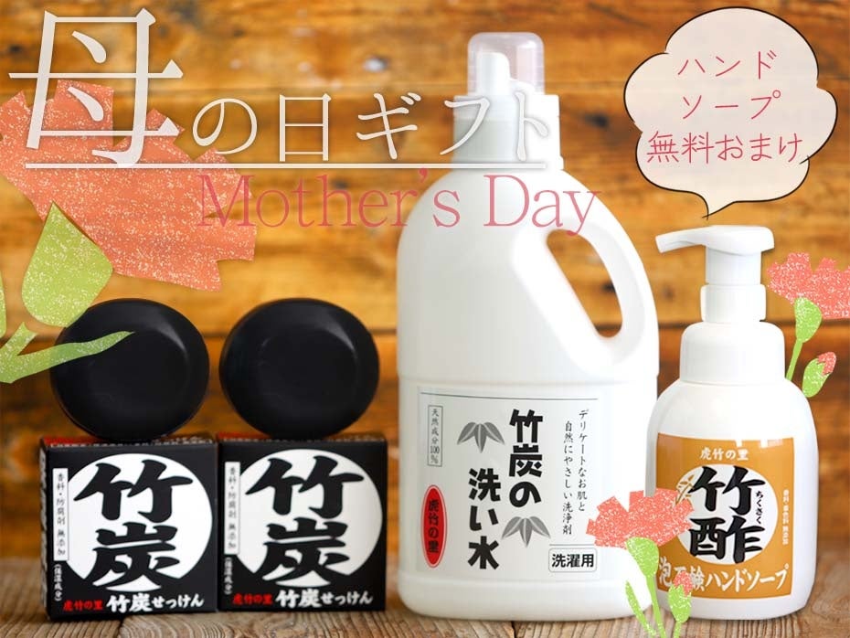5月12日(日)は母の日です。「いつもありがとう」の感謝の気持ちをギフトにのせて贈りませんか?竹虎では、お肌にも、環境にも、心にもやさしい洗濯洗剤「竹炭の洗い水」と無添加の「虎竹の里 竹炭石鹸」2個をセットに。さらに今回は、竹虎創業130周年を記念して特別に「竹酢泡石鹸ハンドソープ 300ml」をプラス1本無料おまけでお届けいたします。