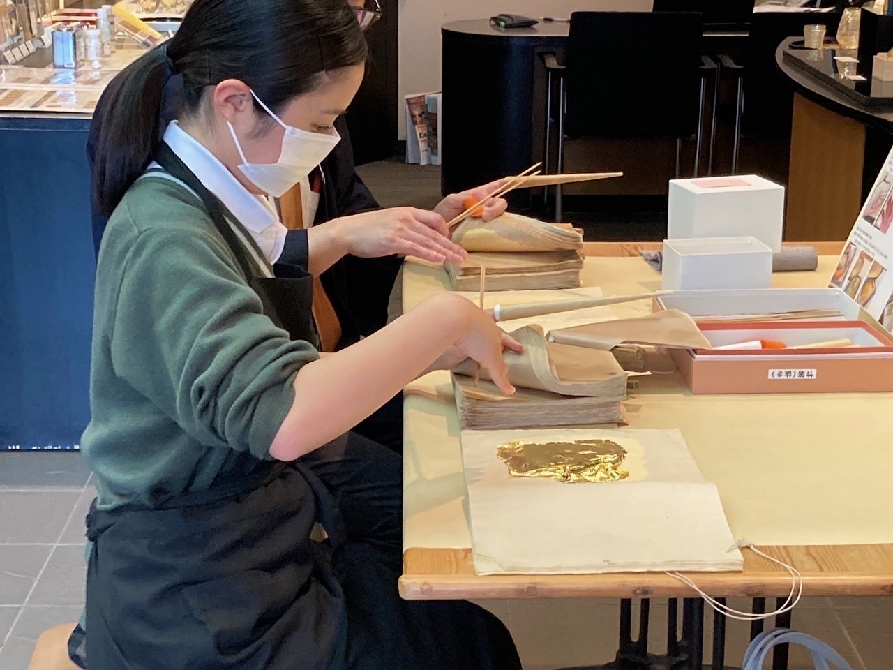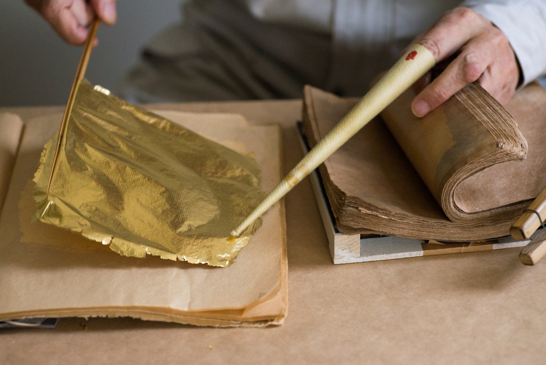 箔座では、ユネスコ無形文化遺産に登録された「縁付金箔」の製法(昔ながらの伝統的な金箔の製法)を学びながら体験できるプログラムを新たに立ち上げました。なかでもマスタープランでは、熟練の箔職人が直接体験を指導します。箔座の「箔づくり体験」は、国宝や重要文化財などの修復に欠くことのできない「縁付金箔」をつくり続ける箔座ならではの、特別な体験プログラムです。