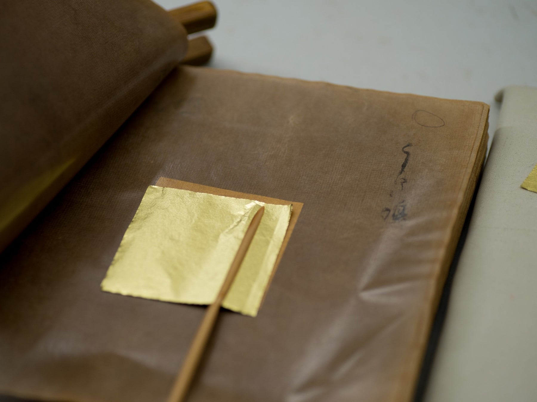 抜き仕事:打ち上がった金箔を、箔打ち紙から抜き取る工程