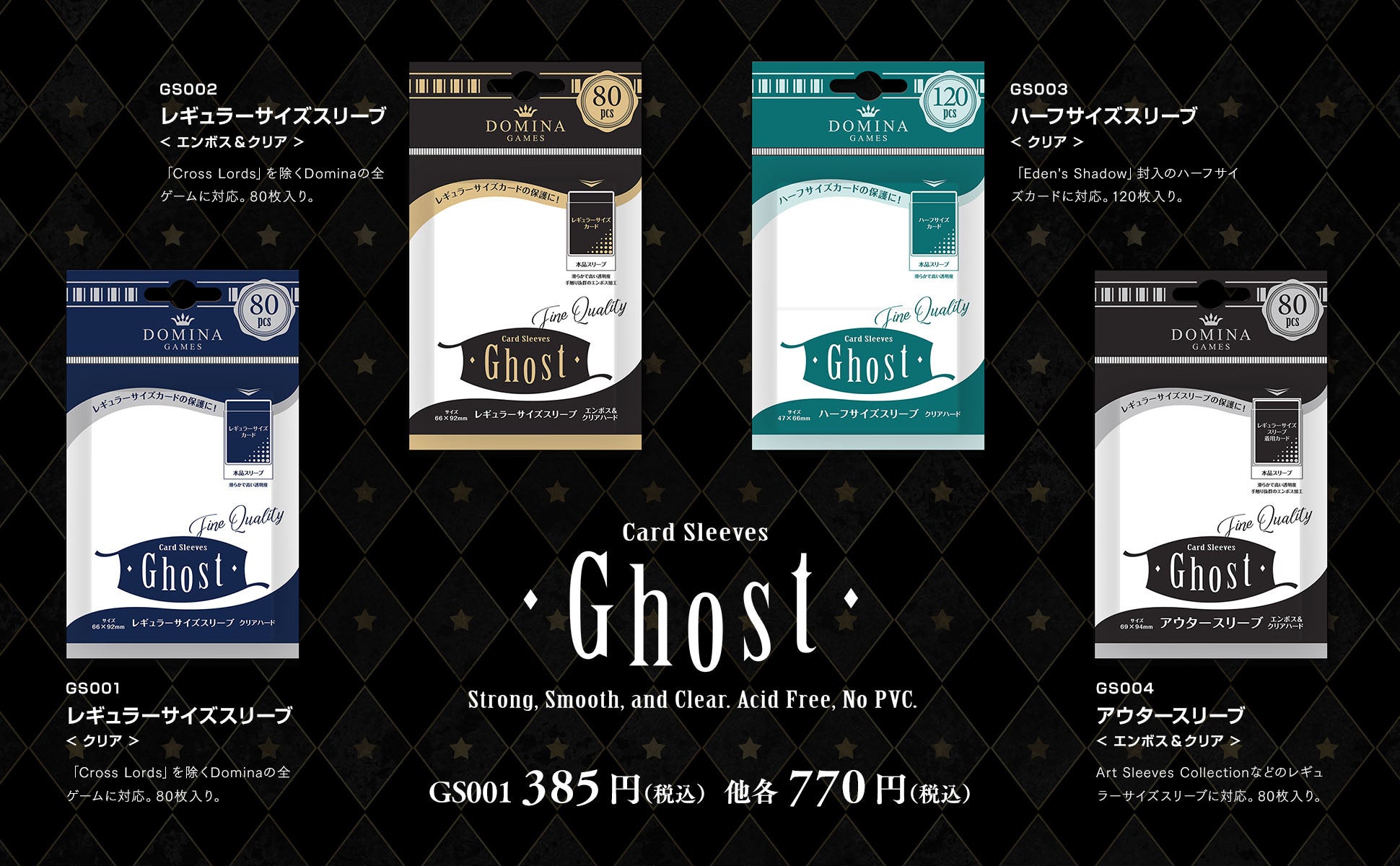 ボードゲームメーカーによるこだわりのクリアスリーブシリーズ「Ghost」にNewバリエーションが登場!GS003は「Eden's Shadow」に含まれるハーフサイズカードに、GS004はレギュラーサイズのキャラクタースリーブを保護するのに最適です。