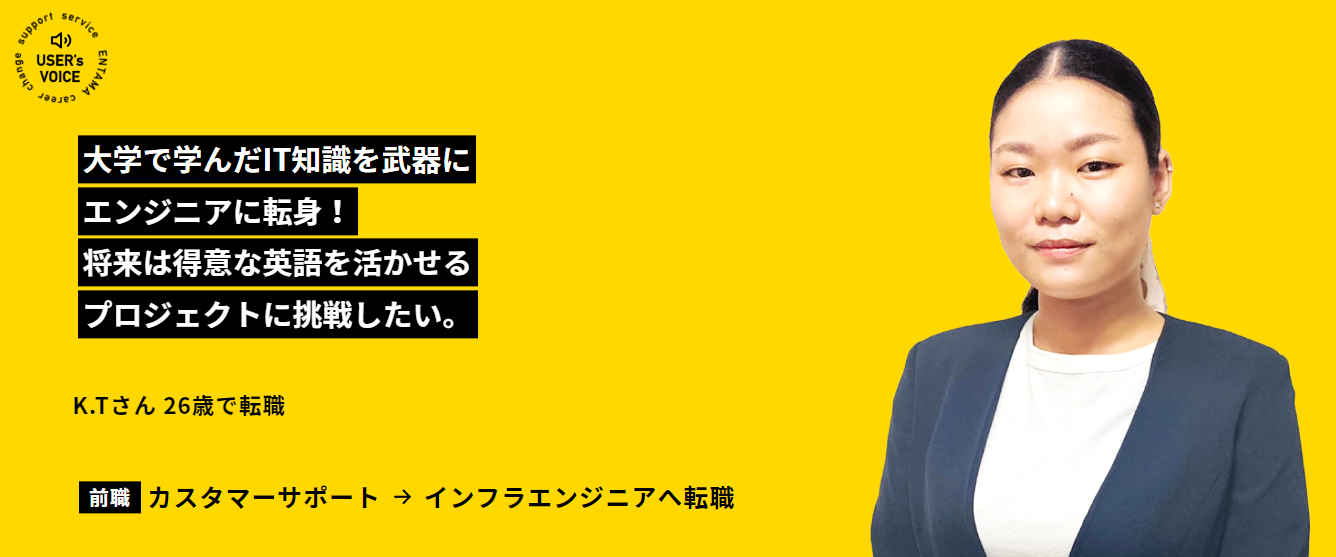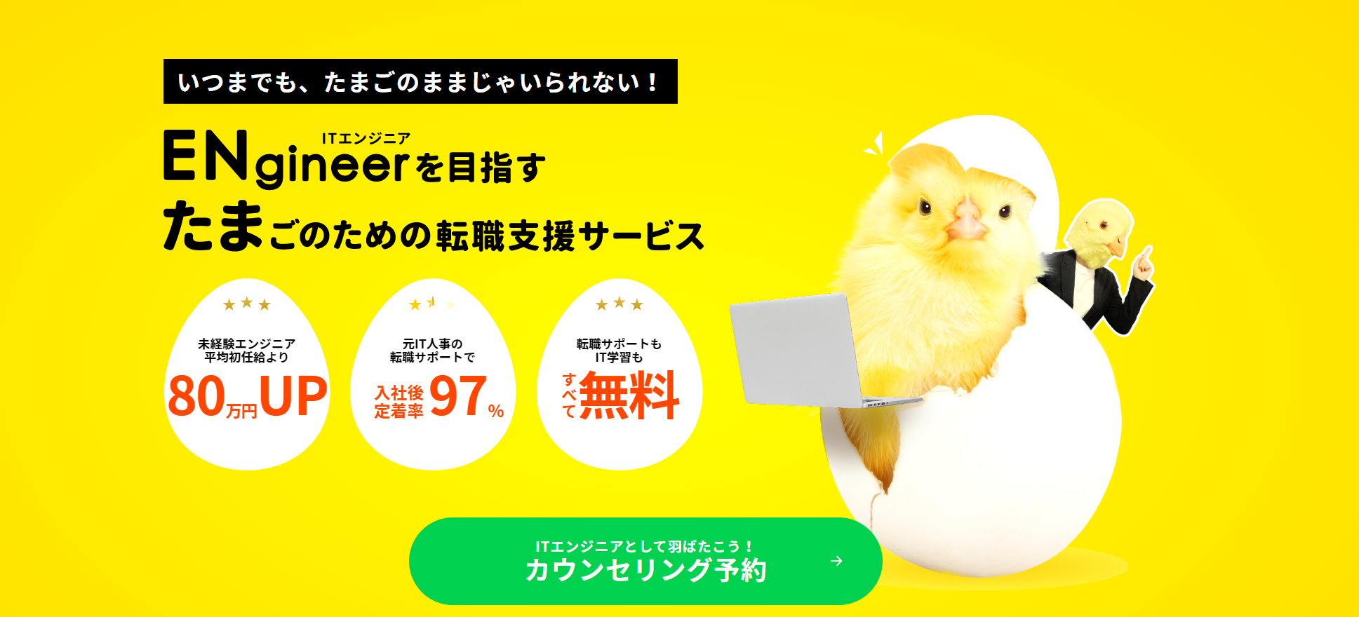 未経験からエンジニアを目指す〝エン(EN)ジニアのたまご(たま)”たち(通称:ENたま人材)が自分の殻を破り、独り立ちするまでをサポートしたいという想いから立ちあがったサービスです。独り立ち(入社後)も「エンジニアになって良かった」「この会社に出会えてよかった」と思い働き続けることができるような転職支援を行ってまいります。
