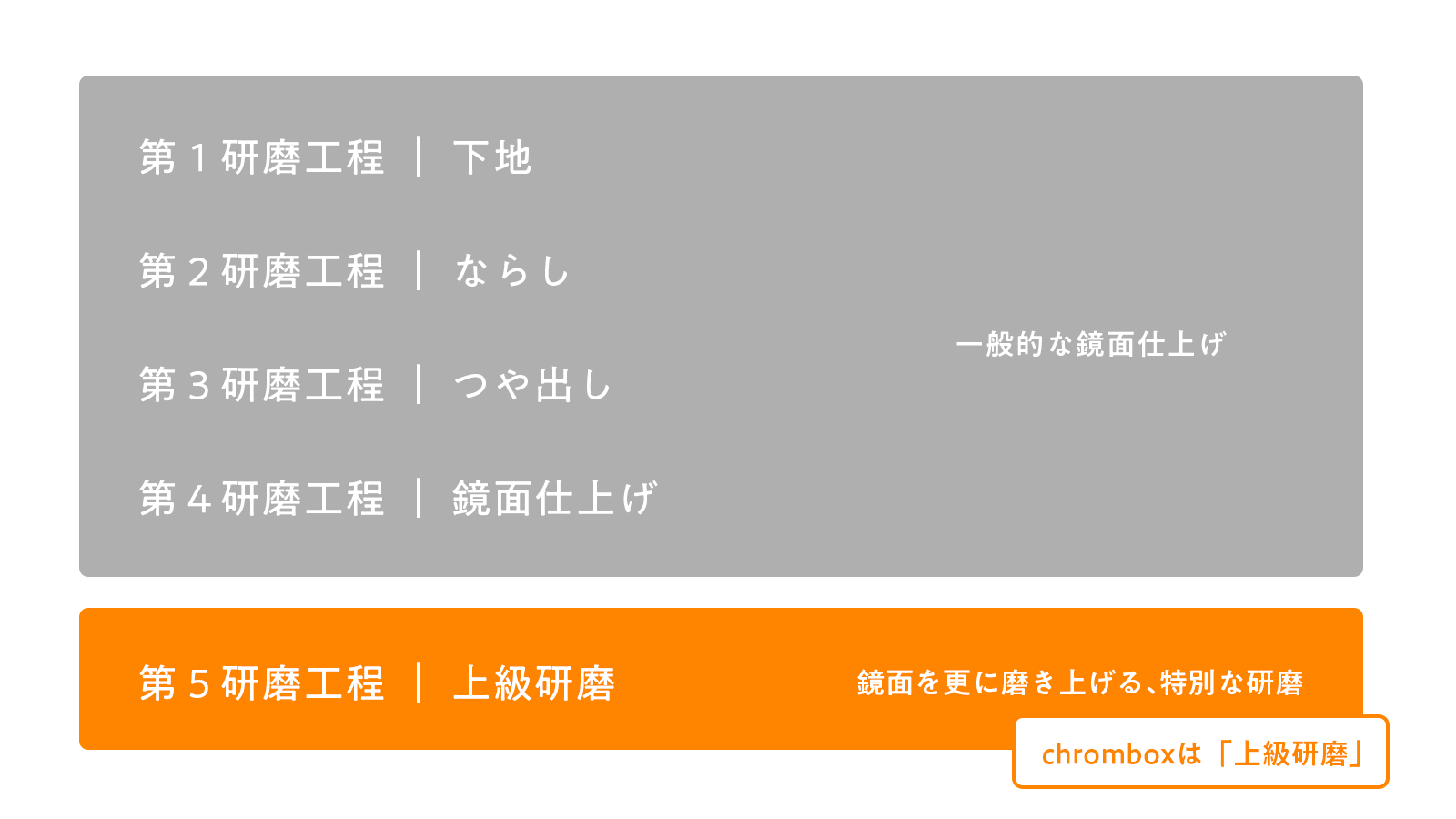 一般的な鏡面仕上げは4段階となりますが、chromboxは更に上をいく「5段階の研磨工程」である上級研磨を実施。鏡面仕上げを超えた「極みの鏡面仕上げ」に磨き上げます。