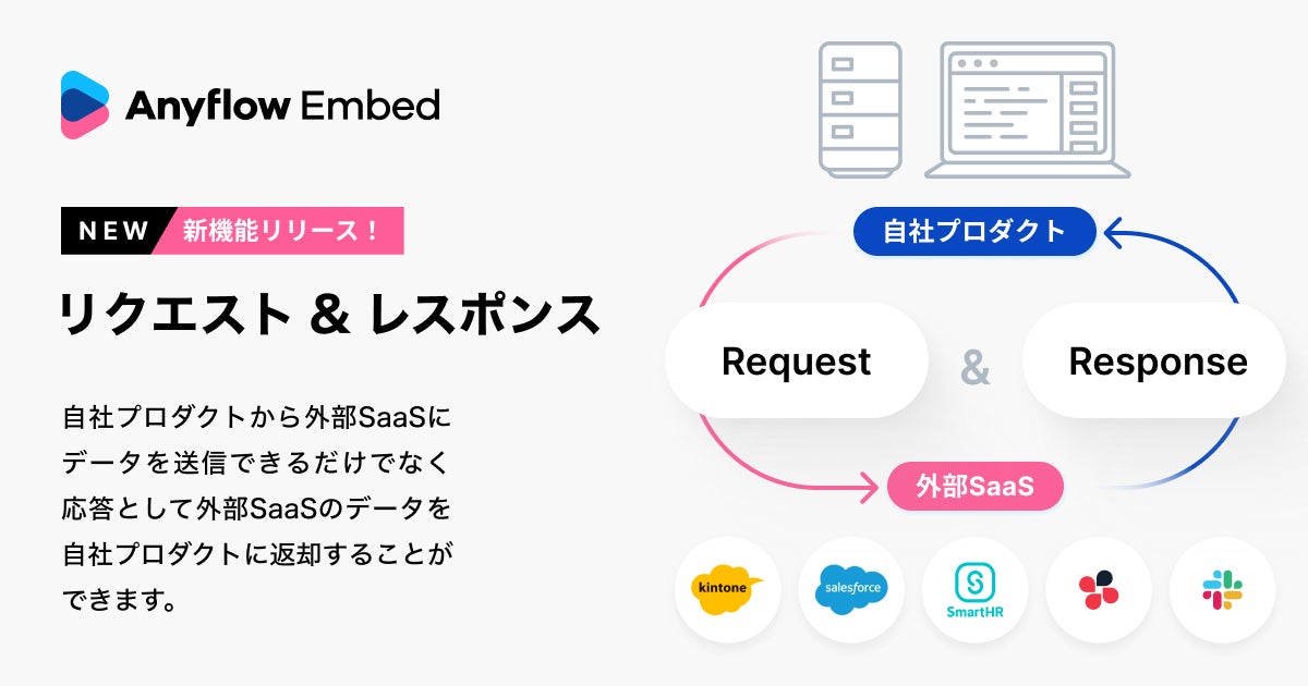 Anyflow株式会社(本社:東京都千代田区、代表取締役CEO:坂本 蓮、以下Anyflow)は、SaaS事業者向けのAPI連携プラットフォーム「Anyflow Embed」の新機能、「リクエスト&レスポンス」をリリースします。本機能により、公開APIを持たないSaaS事業者も、外部SaaS製品とのデータの送受信を簡単に実現できるようになります。