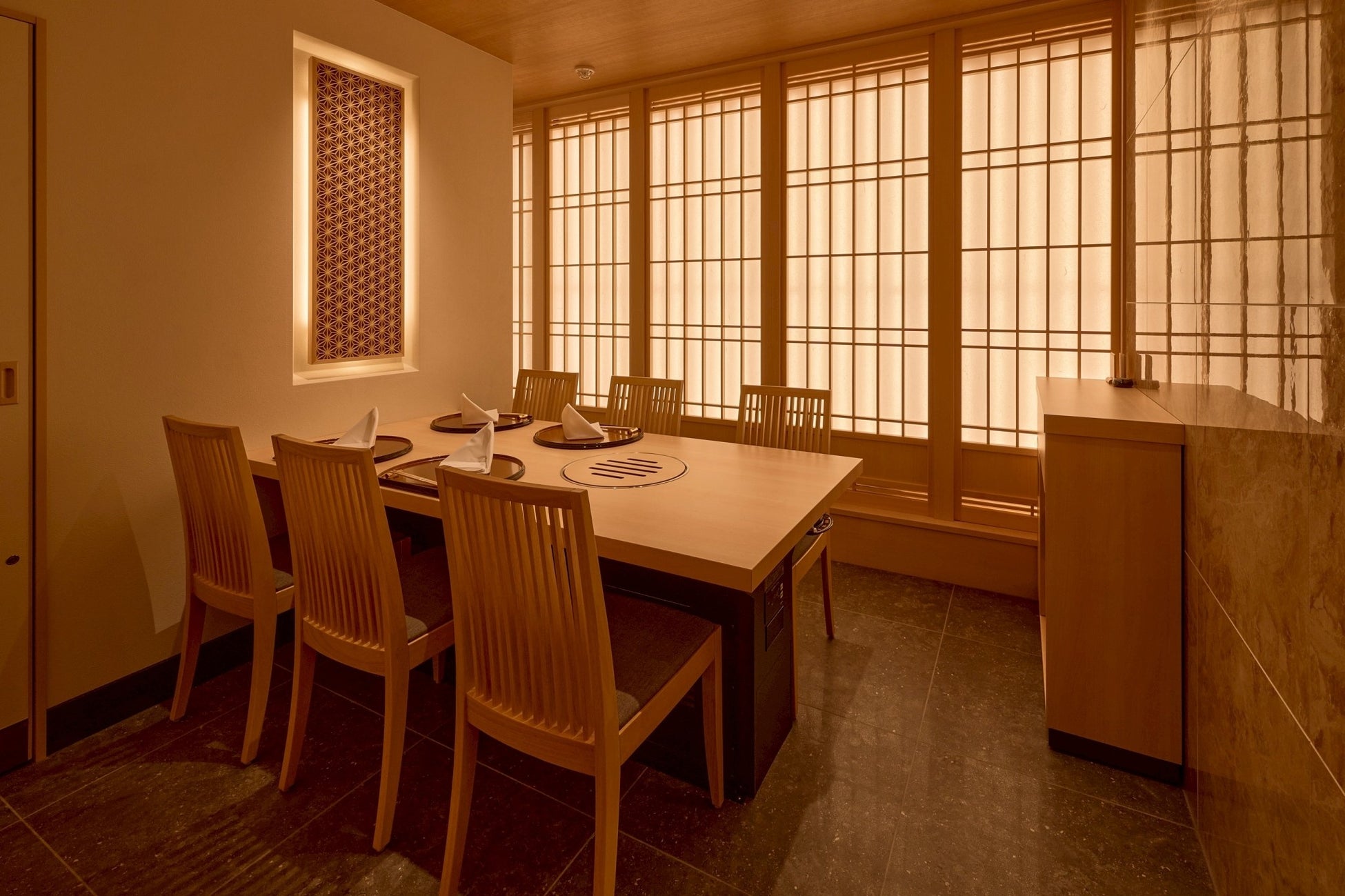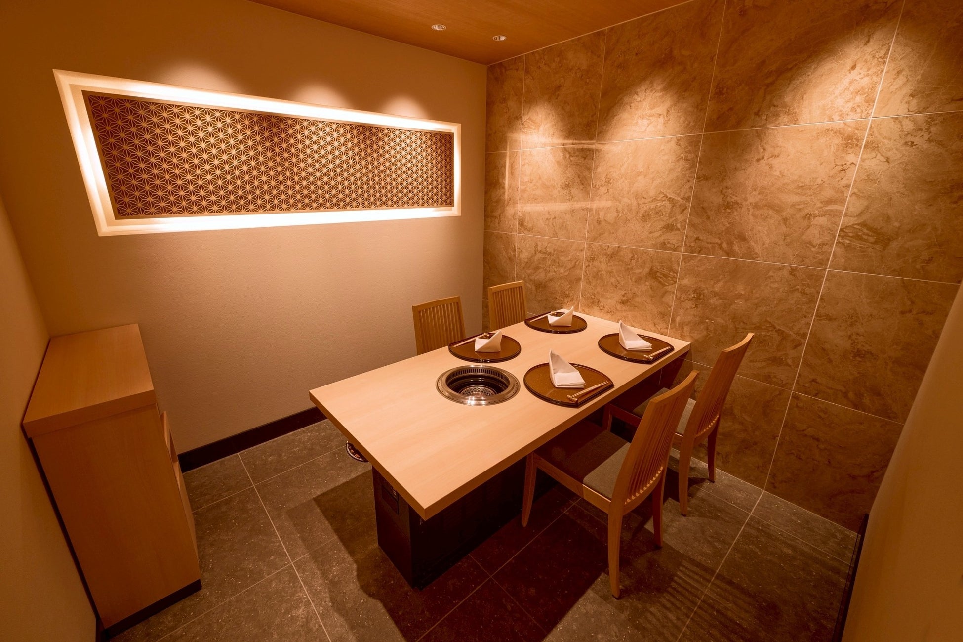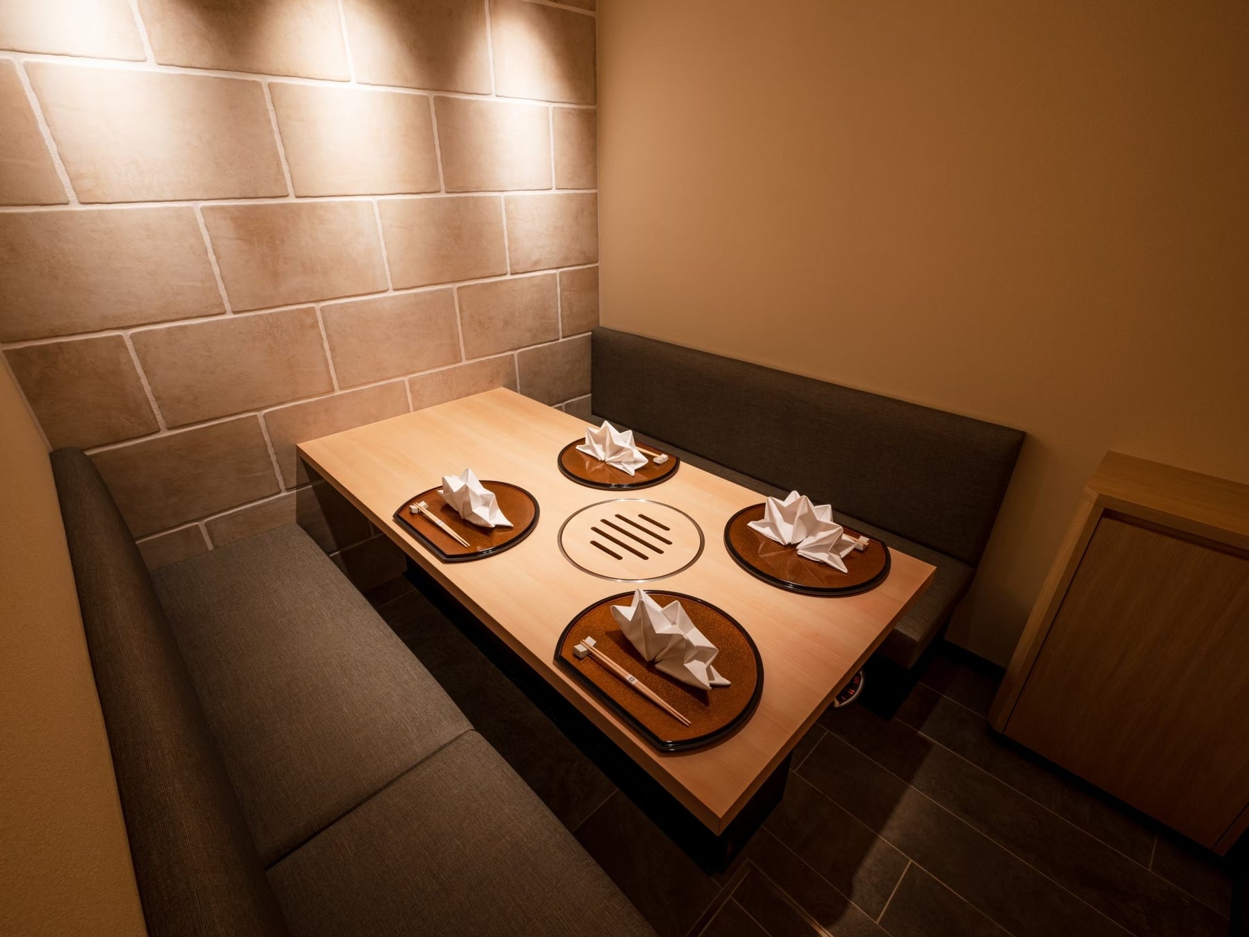 3. 「全席完全個室」と「焼師」によるフルアテンドサービス 大切な記念日や会食、接待にも最適な「全席完全個室」の空間。当グループの誇りである『焼師』が、一枚一枚最高の状態で焼き上げるフルアテンドサービスにより、お客様を最高の状態で厳撰和牛の世界へ誘います。
