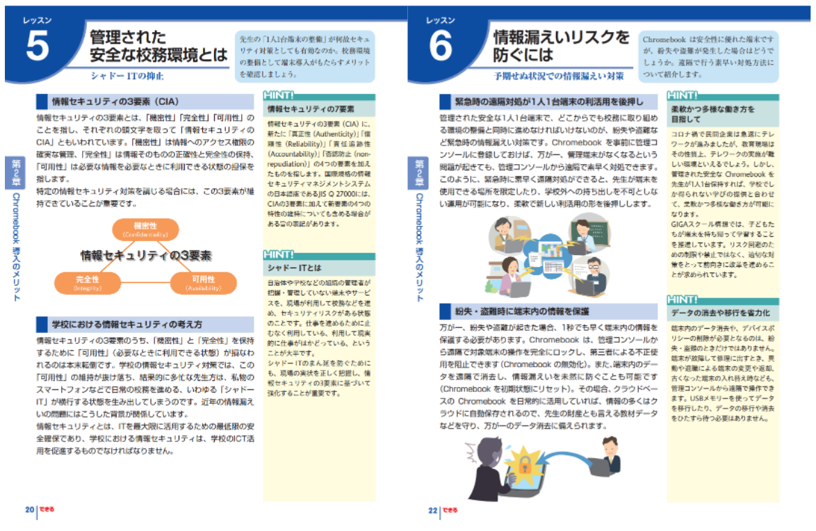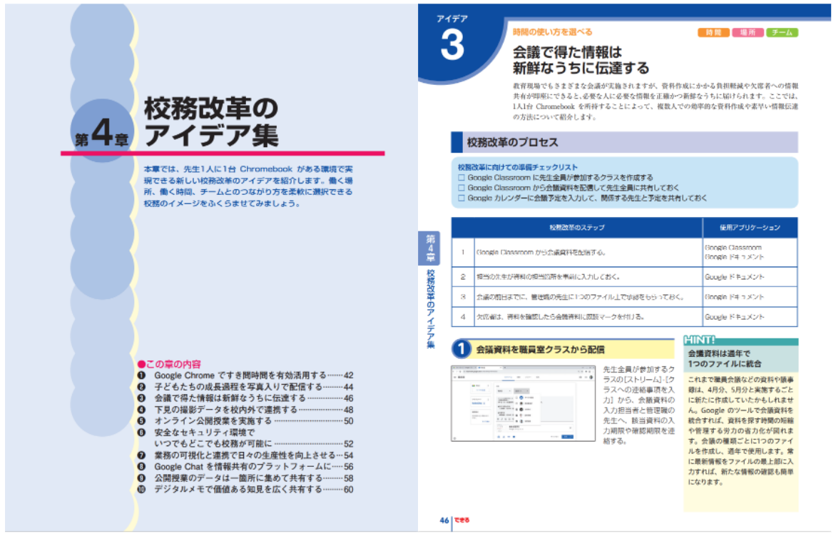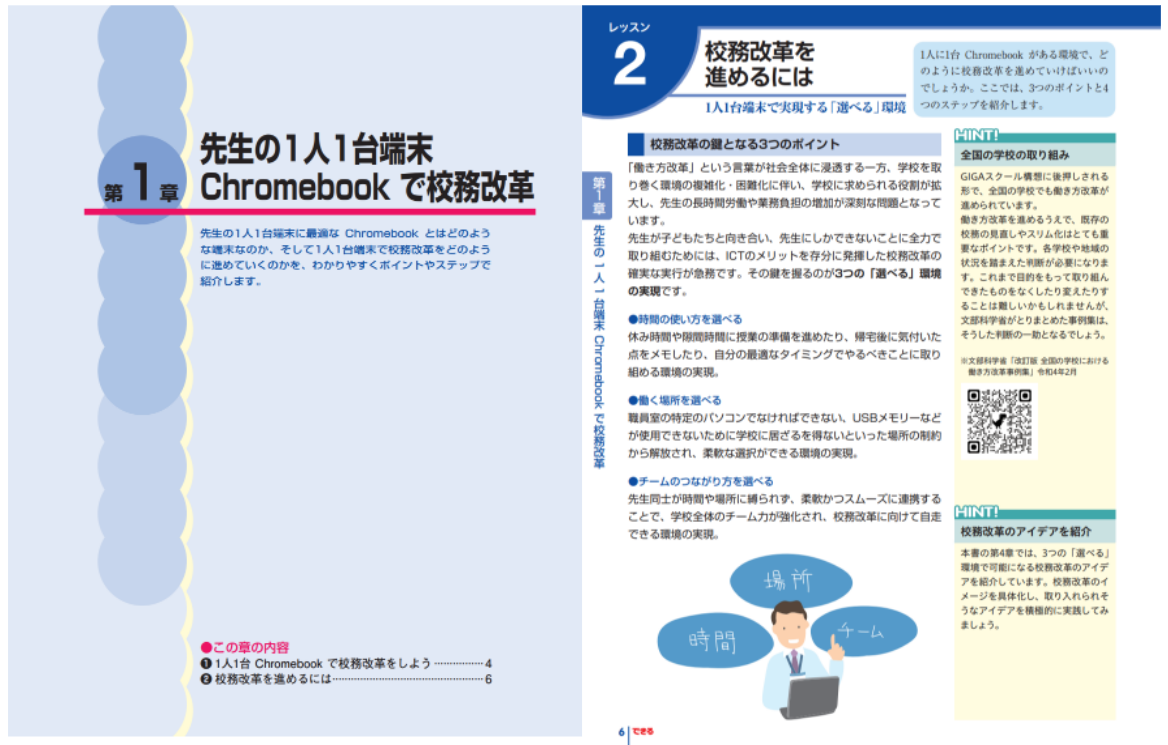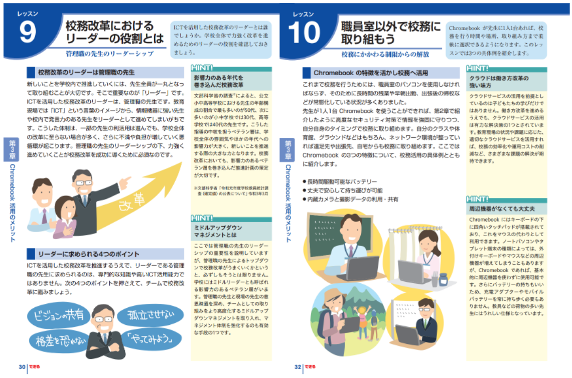 ICTツールを活かして校務改革を進める上で前提となるのが、先生が必要な時に柔軟に使える「1人1台端末環境」です。本書では、1人1台端末環境を整備する際に強い味方となる Chromebook について、ICT管理者向けの「Chromebook 導入のメリット」、現場の先生向けの「Chromebook 活用のメリット」、最後に Chromebook とGoogle Workspace for Education による実践的な「校務改革のアイデア集」の3つの視点で紹介します。