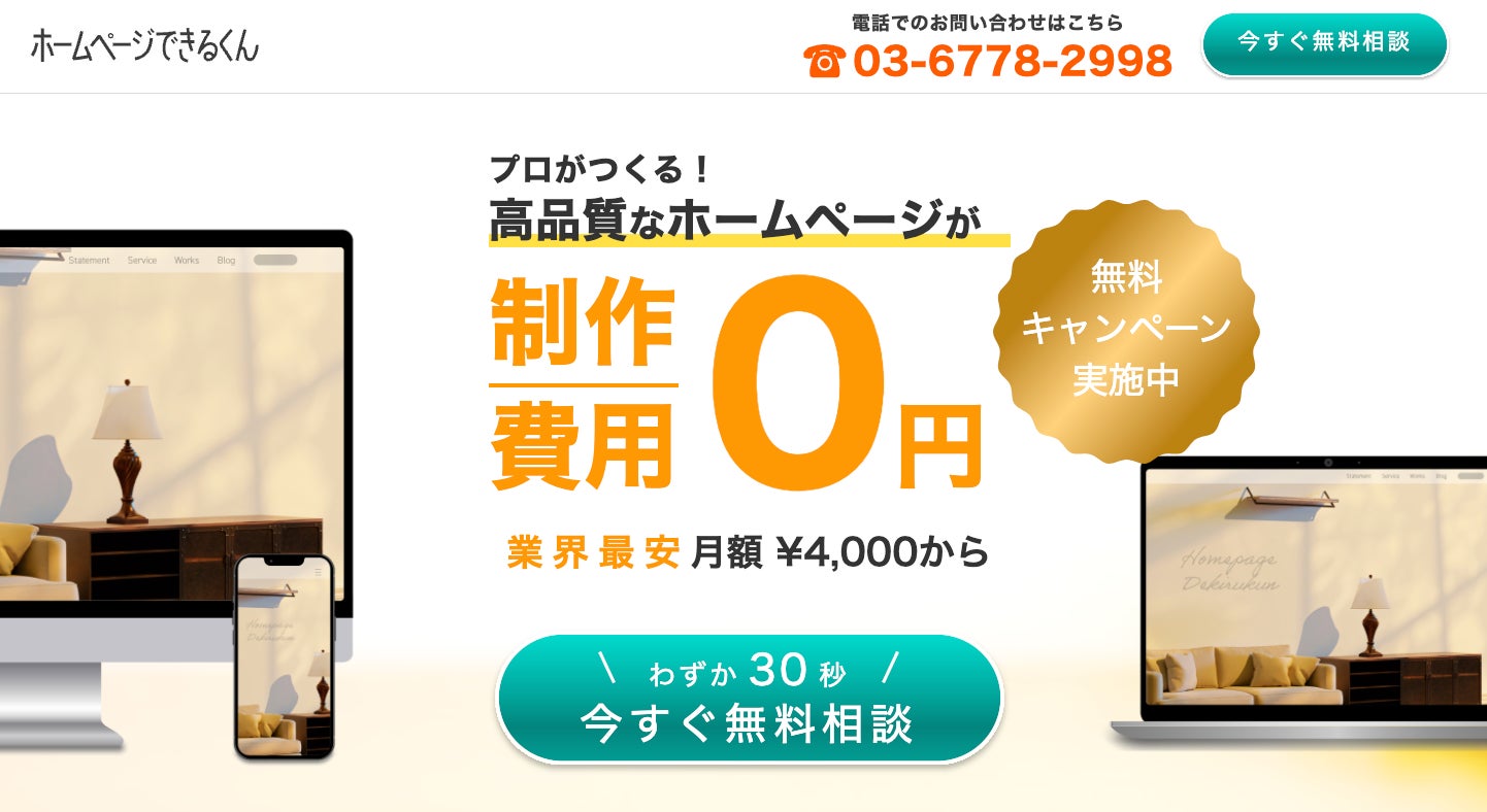 ホームページできるくんは数千円という低価格で、高品質なホームページ制作が依頼できるサービス。手軽な価格設定で工務店や飲食店・サロンなどの開業から、企業のホームページまで幅広く対応可能です。また完成後の修正も無料で対応。ホームページの運用もお任せできます。