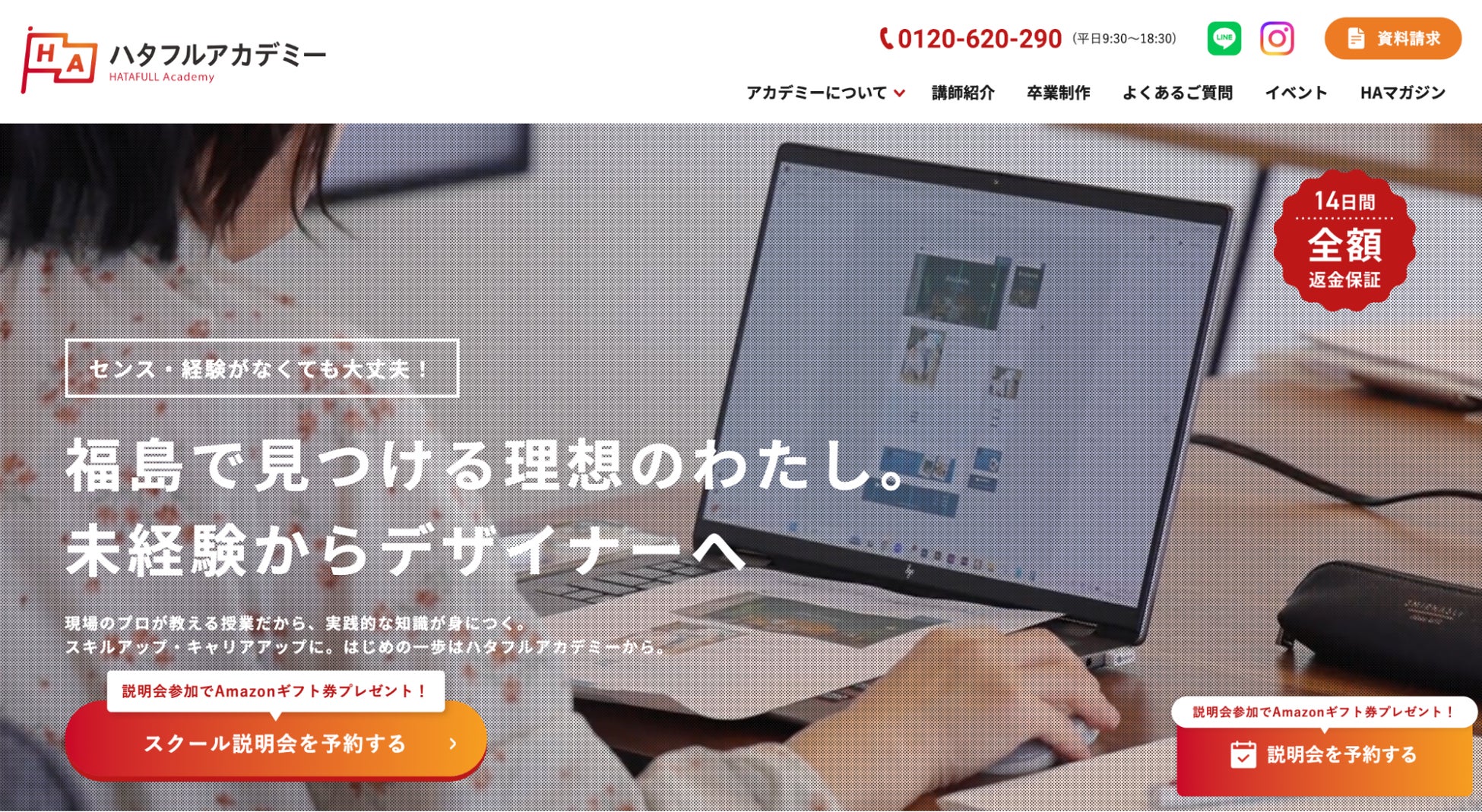 ハタフルアカデミーは、福島県内で展開するスクーリング形式のWebデザイナー養成スクールです。現役デザイナー講師による対面授業と自宅で学べる動画授業で実践的な技術やノウハウを効率的に学習し、6ヶ月でWebデザイナーを目指します。 2022年4月の開校から延べ250名以上もの卒業生を輩出。「育児・家庭と仕事の両立」「将来を見据えたキャリアアップ・リスキリング」「再就職」など、理想の働き方や新たな挑戦のために受講する方が多数。
