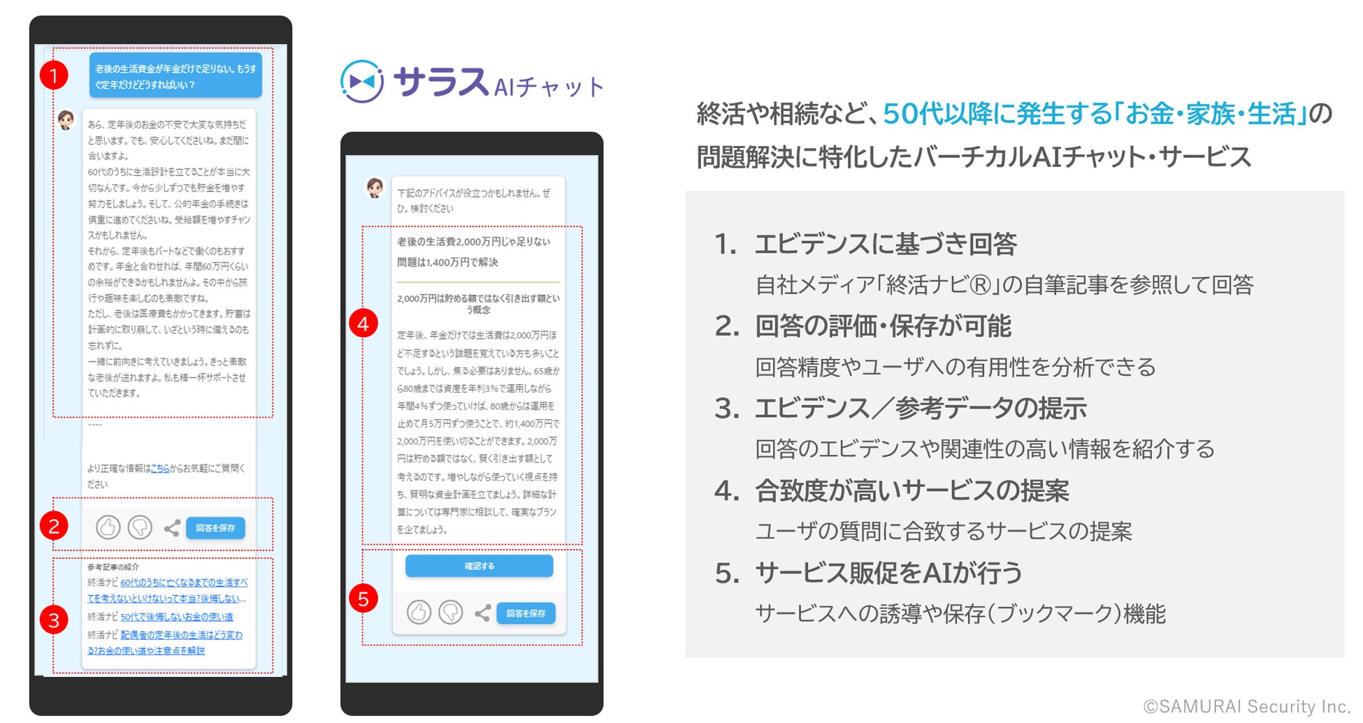 サラスAIチャットは終活世代・終活や相続をはじめとした後半生のお金・家族・生活に関する相談に特化した「バーチカルAIチャット」で、ユーザの質問に対する回答だけでなく最適なコンテンツやサービスの紹介、回答エビデンスの提示などよりビジネス利用に特化した機能を持つチャットボットです。