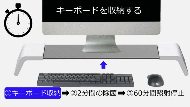 キーボード、スマホ、マスクなどPC周りの小物を除菌+収納でスッキリすることができるワイド設計と
