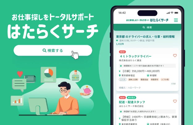 『はたらくサーチ』は、全国500箇所以上に設置され、数十万件以上の求⼈を取り扱う”ハローワーク”の求人データに着目し、仕事探しから応募までをトータルにサポートする求職者向けの求⼈検索サイトです。