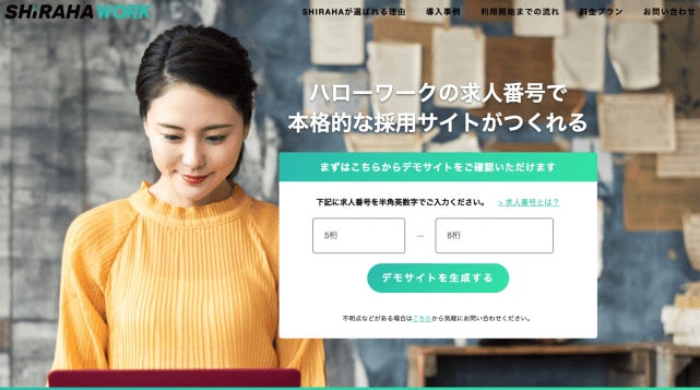 『SHIRAHA』は、誰でも手軽に求職者心理を追求した採用サイト(人材募集専用サイト)がつくれるサービスです。特にハローワークをご活用中の企業様にとっては、ハローワーク求人番号”を入力するだけでサイトが瞬時に作成されます。