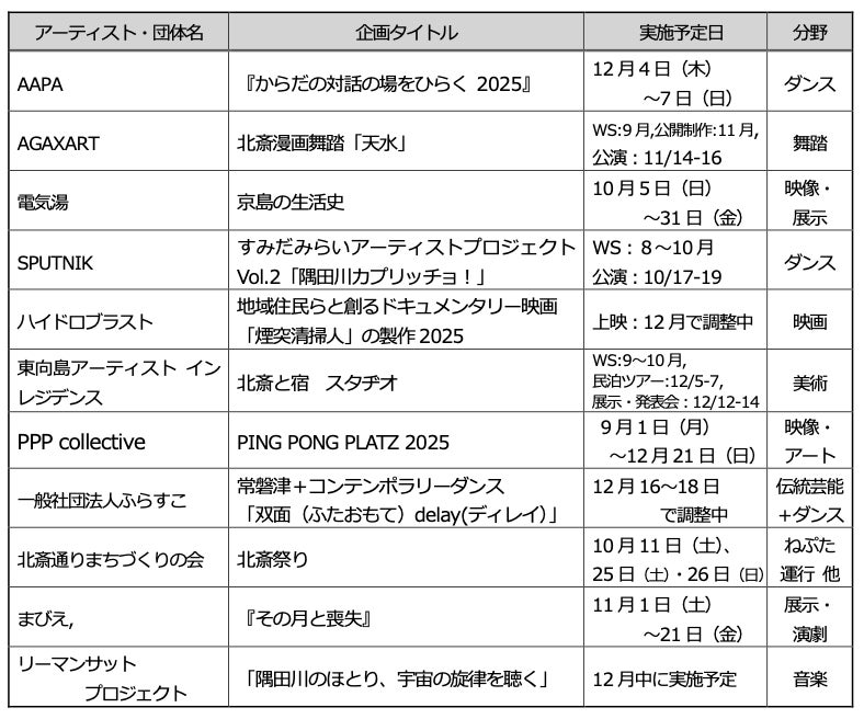 「隅田川 森羅万象 墨に夢」(通称:すみゆめ)は「北斎」「隅田川」を主なテーマに、すみだの地域資源を活用するアートプロジェクトです。10回目を数える今年は、9月1日(月)から12月21日(日)までをメイン期間に、墨田区を中心とする隅田川流域で公募による11件(応募数:42件)の企画と2件の主催企画を展開します。アーティストが地域をリサーチして創作し、ワークショップによる参加や、まちなかで体験・交流できる企画が多数。各企画の詳細は8月以降、順次WEB等で発表します。