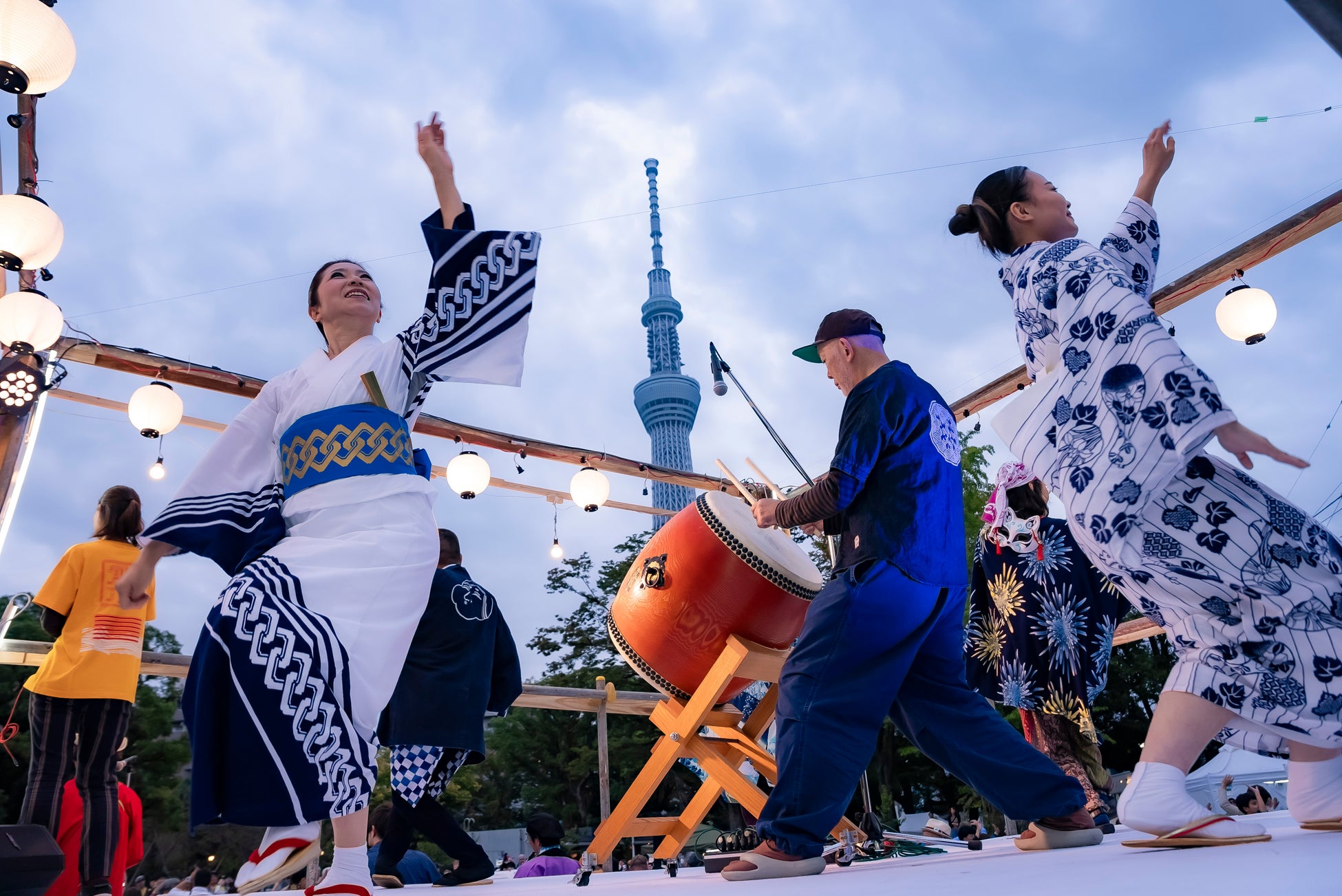 北斎が描いた「踊行列図」をモチーフに、隅田川沿いの隅田公園そよ風ひろばに櫓を設けて、生演奏による盆踊りを中心に繰り広げる「すみゆめ踊行列」。岸野雄一のプロデュースにより、多彩な歌い手と演奏家を迎え、地元の踊り手や芸能団体等を交えて、老若男女、誰もが気軽に参加できるプログラムで構成します。[後援:公益財団法人日本民謡協会]