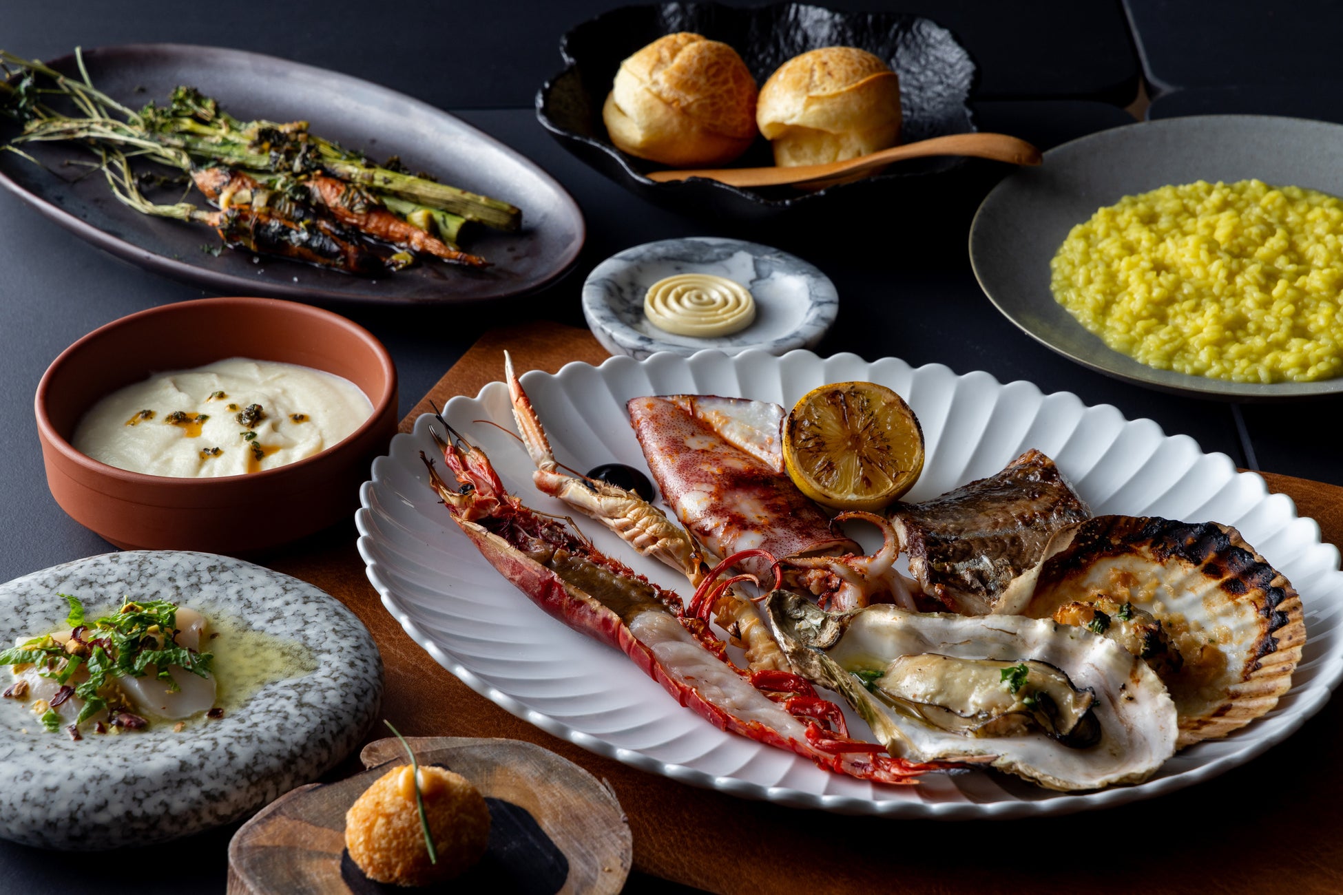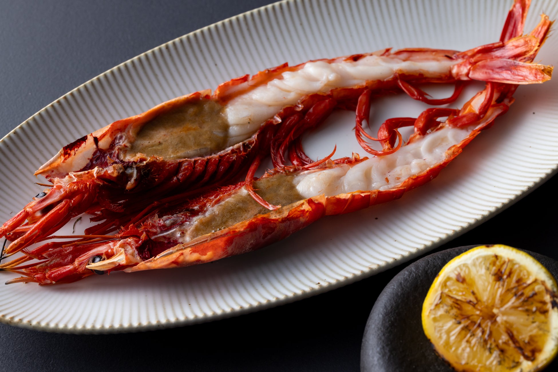吉澤畜産厳選 枝枯らし(枝肉のままドライエージングしたお肉)した黒毛和牛骨付きリブロースやミスジ。また、カラビネーロ(深海に棲む濃厚なミソが特徴の希少な天然エビ)は薪の熾火で焼き上げるとどれも旨味が増し、贅沢な味わいに。是非とも味わって頂きたい一品です。