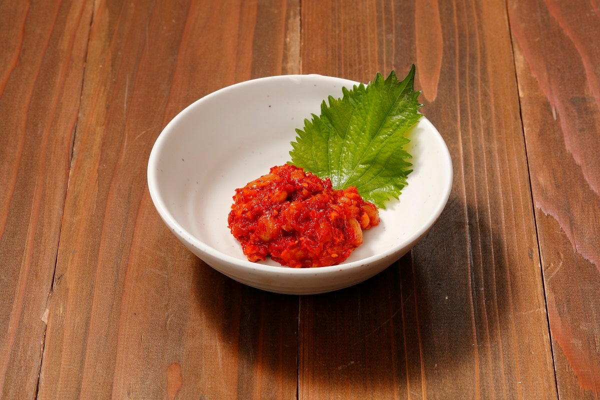 真鱈の胃を塩漬けにし、辛さと甘さがちょうど良い特製の甘辛ヤンニョムを加えた究極の珍味キムチです。厚みがありプリプリとした食感で、噛むごとに旨みが口に広がり食欲を刺激します。新鮮な海鮮の風味と甘辛な味付が相性抜群の一品です。