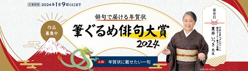 筆ぐるめ 31 2024年版もおすすめする俳句年賀。今年も俳句大賞を開催します。審査には「夏井いつき」先生にご協力いただき選句させていただきます。最優秀賞、優秀賞に選ばれた俳句を夏井先生に講評もおこなっていただき、発表後に講評動画も公開します。最優秀賞、優秀賞などの賞と賞品を予定しておりますので是非ご参加ください。