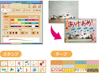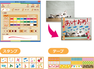 写真付き年賀状などの作成時にプレビュー画面で直接お絵かきができます。「ペン」でお絵かきはもちろん、豊富な「スタンプ」や「テープ」でデコレーションを楽しみながらオリジナルの年賀状を作成できます。