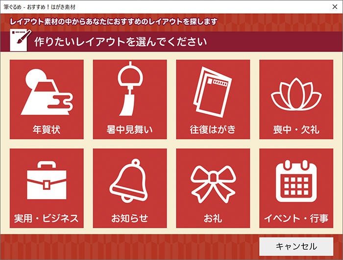 選択可能なレイアウト:年賀状、暑中見舞い、往復はがき、喪中・欠礼、実用・ビジネス、お知らせ、お礼、イベント・行事