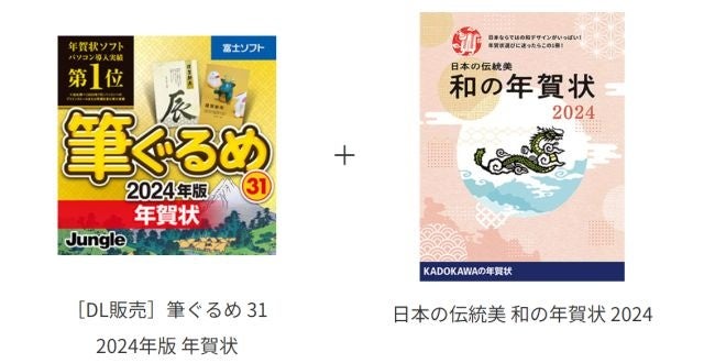 辰年限定素材を同梱した筆ぐるめ 31 2024年版 年賀状に、大人気のKADOKAWAの年賀状素材集『日本の伝統美 和の年賀状 2024』から厳選したレイアウトデータを収録したオリジナル版を発売。