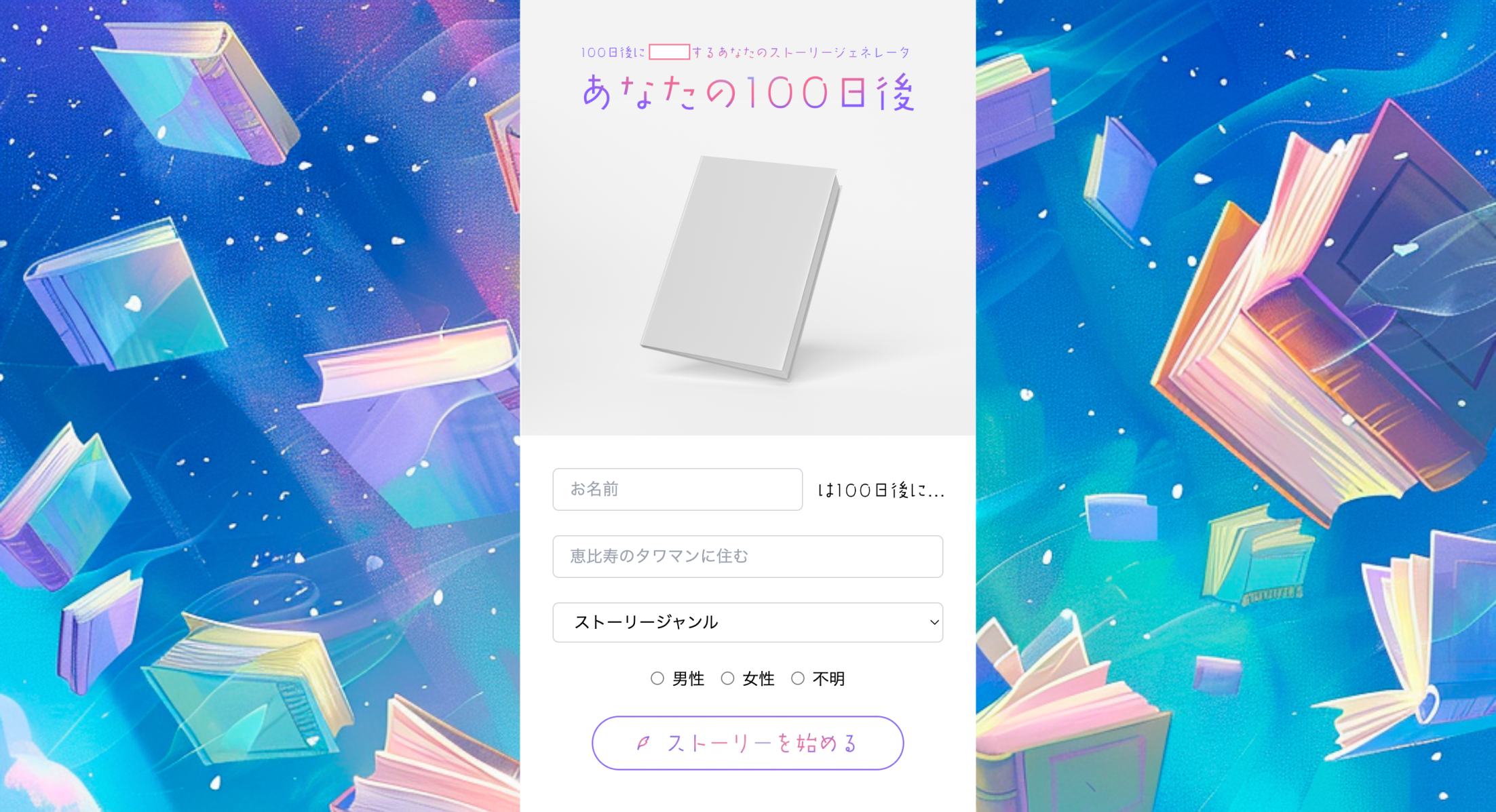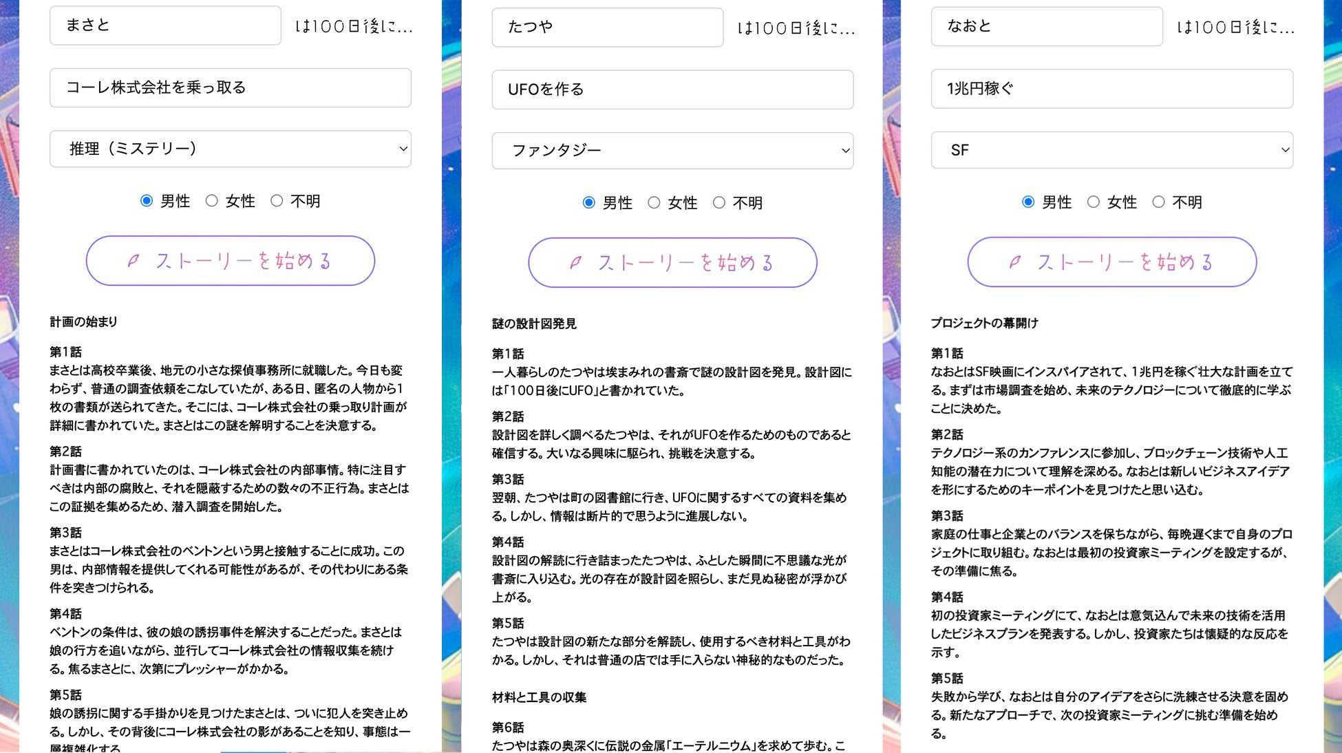 誰でもその場で設定したテーマで、AIがカウントダウン形式で100日後の未来ストーリーを生成できるサービスです。例)「100日後に会社を乗っ取る」「100日後にUFOを作る」「100日後に1兆円稼ぐ」