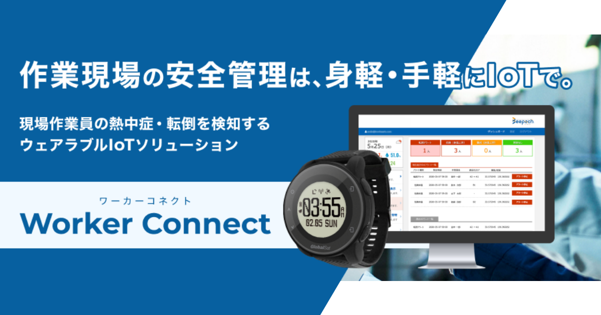 「ワーカーコネクト」は、従業員の健康管理や安全確保を支援するクラウド型の安全管理ソリューションです。特に、建設現場や製造業の工場に加えて、近年では省力化された夜間勤務の現場などで導入されています。作業員のバイタルデータ、位置情報、転倒状況などを腕時計型デバイスでセンシングし、専用アプリケーションによる作業場所の把握や健康状態の可視化と異常時のアラート通知によって、熱中症の予防や転倒事故の検知を行います。