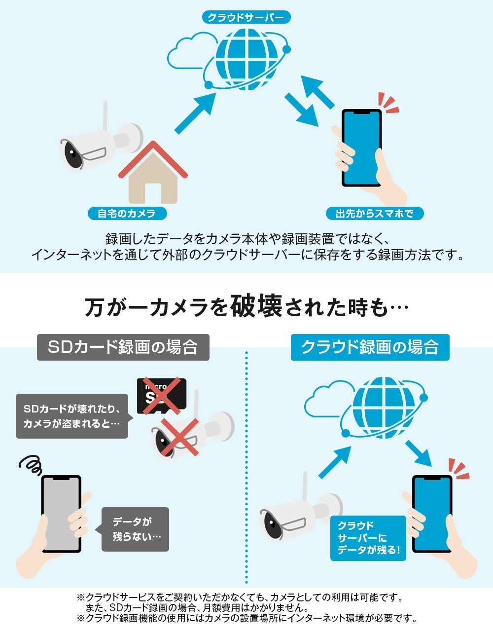 月額サービスのクラウド録画サービスを利用すれば、万が一カメラが破壊されてもクラウドサーバーにデータが残ります。