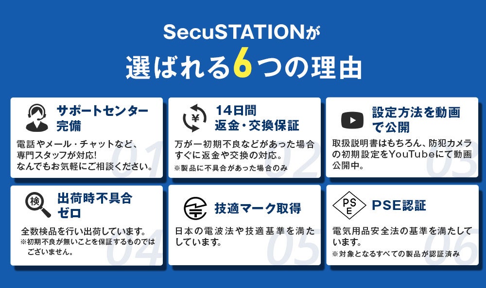SecuSTATIONは、技適マーク/PSE認証取得、安心の14日間返金・交換保証のネットワーク防犯カメラブランドです。サポートセンター完備、使用方法の動画も多数ご用意しており、サポート体制も充実しております。