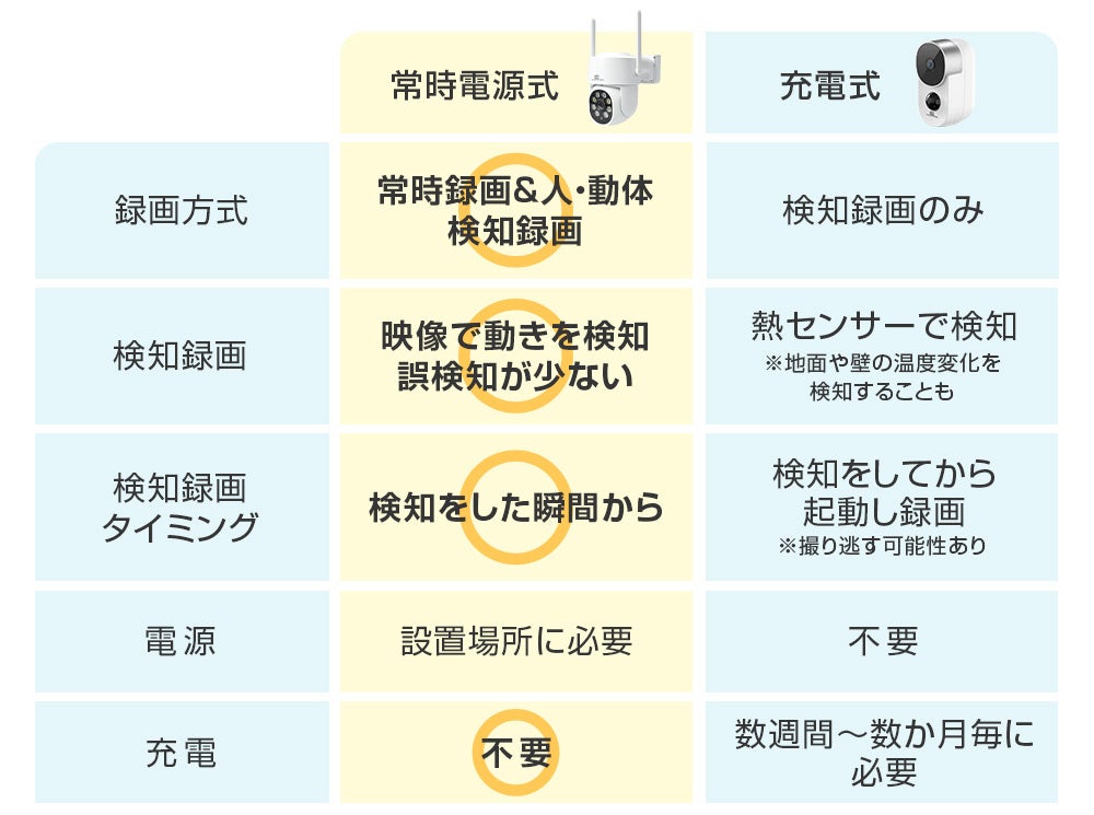 防犯カメラには、常時電源式と充電式の2タイプがあります。