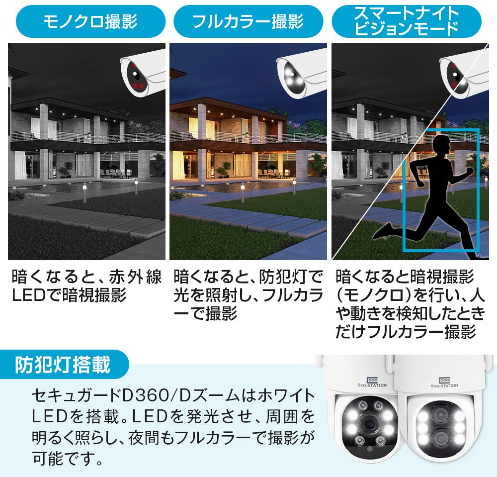 セキュガードD360/Dズームは、ホワイトLED搭載。夜間でもフルカラーでしっかり撮影ができます。
