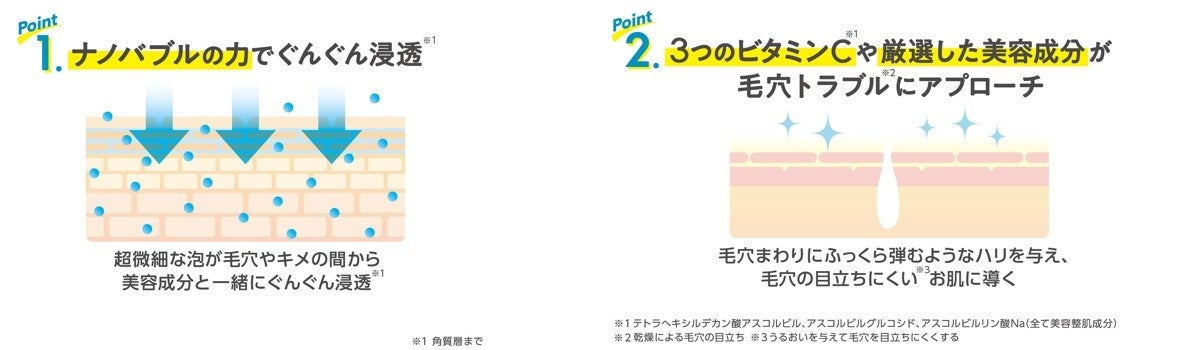 この商品は、ナノバブルが3種のビタミンCや厳選した美容成分の浸透※2をサポートし、毛穴が目立ちにくい※3なめらかな肌に導きます。