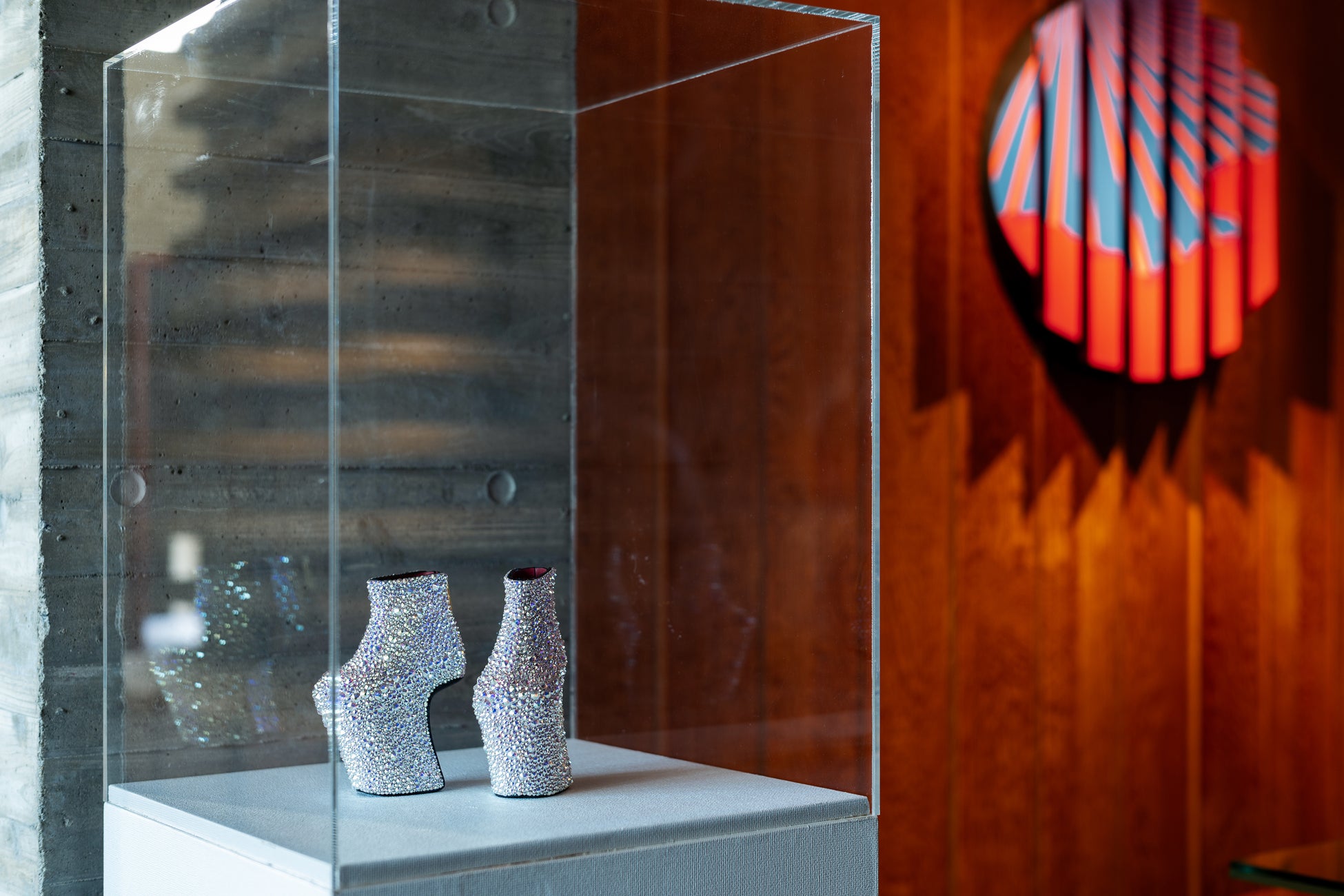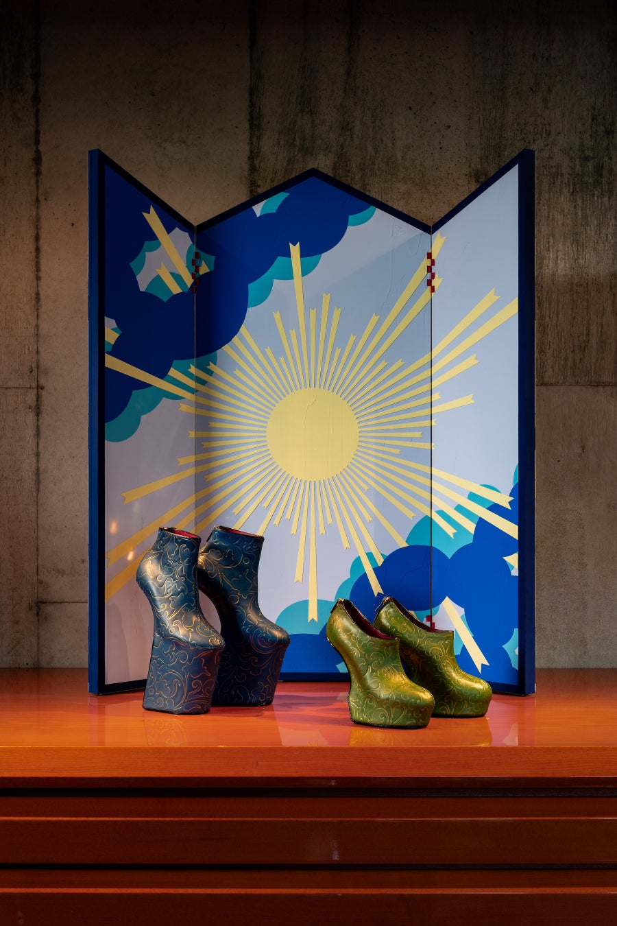 北陸工芸・アートの祭典「GO FOR KOGEI」の開催時期(2024年9月14日から10月20日まで)に合わせて、「リバーリトリート雅樂倶」の館内に舘鼻則孝の代表作品《Heel-less Shoes》や絵画作品など10点が展示公開されています。
