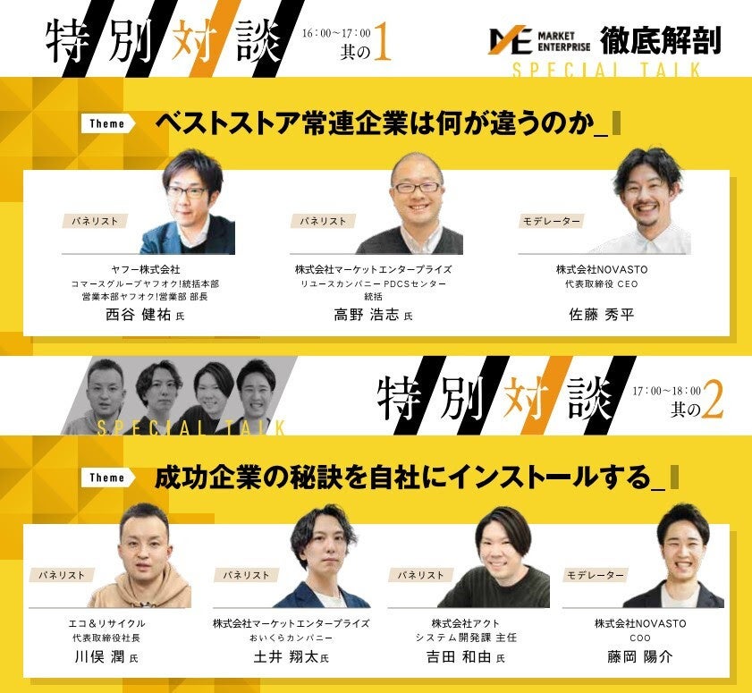 リユース売上爆増セミナーでは、2部構成でそれぞれで異なる特別ゲストをお迎えした対談型のセミナーとなっています。