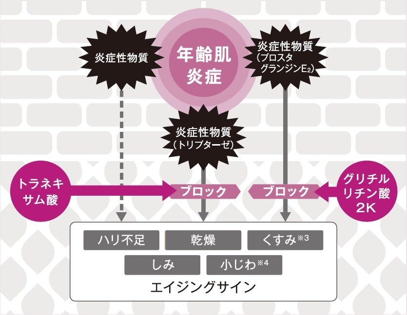 有効成分トラネキサム酸とグリチルリチン酸2Kが年齢肌炎症*1によって発生する炎症性物質にアプローチします。