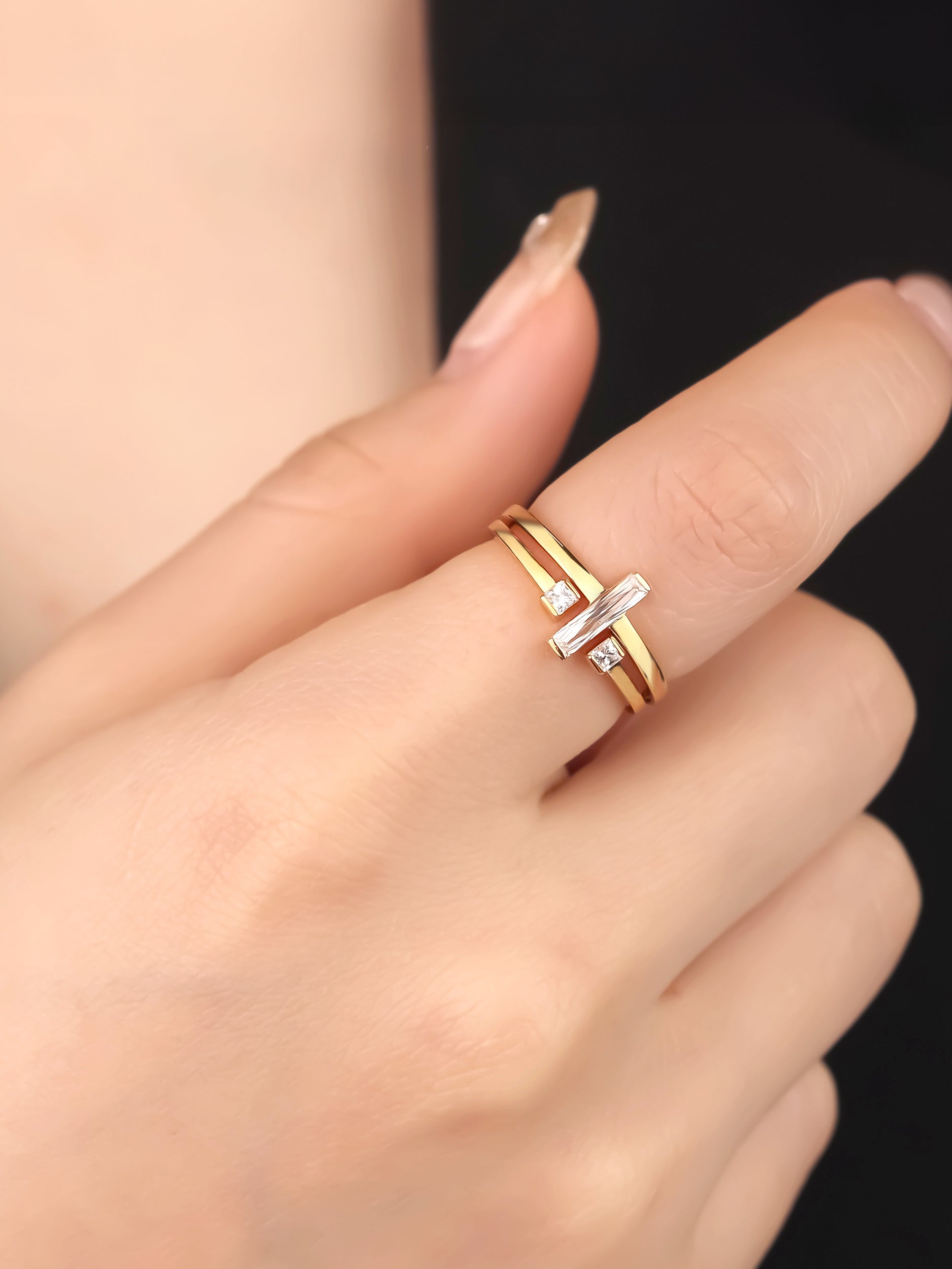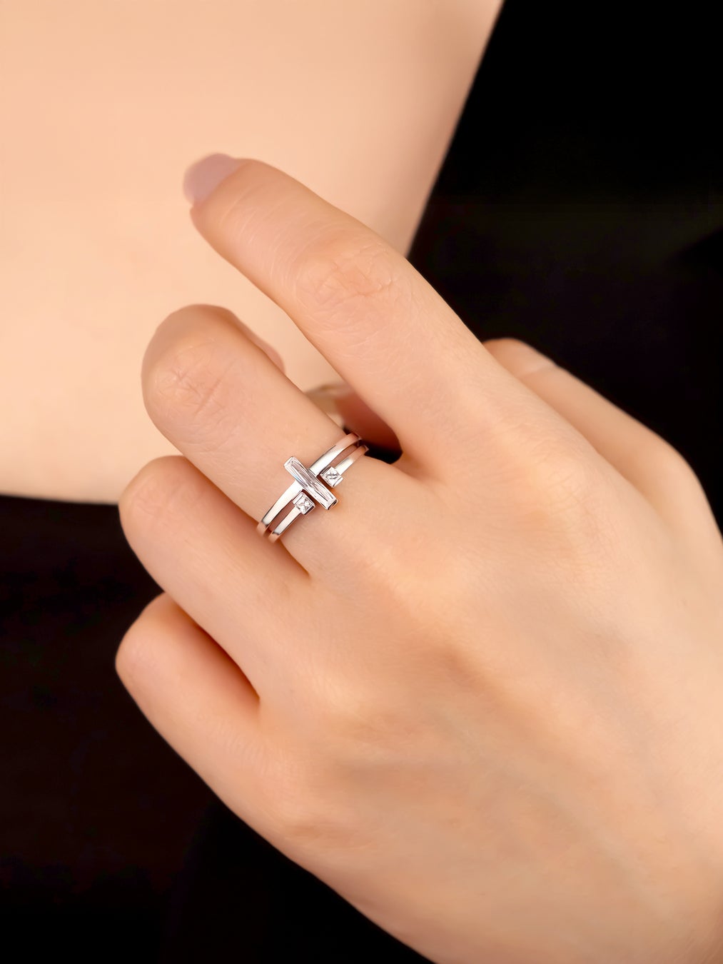 リングは、縦に配したバケットプリンセスカットのデザインと、2石をあしらったフォークリングが、が、重ねづけ時に最も美しく見えるバランスで設計。