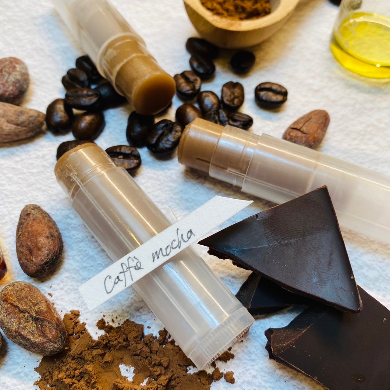 カカオを入れてチョコのように茶色で可愛く、コーヒーの精油でほんのり香ばしさを楽しめる「カフェモカオリジナルリップ(3本)」が簡単に作れる、オーガニッククラフトシリーズ!おうち時間やクラフトレッスンに最適です!