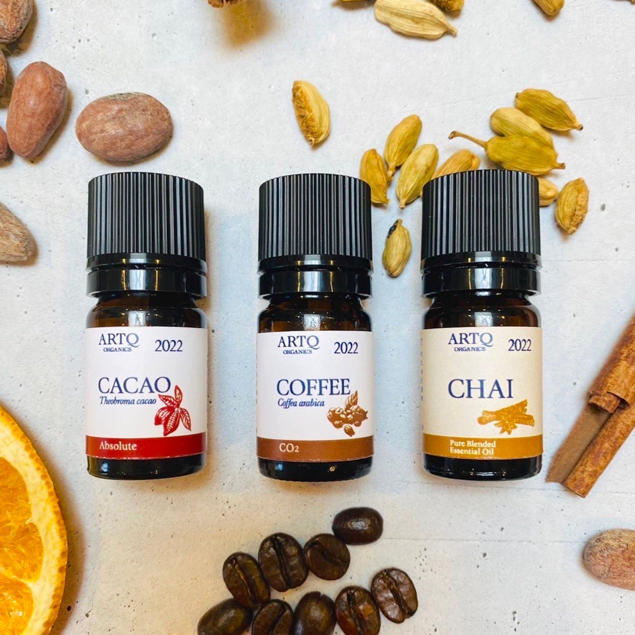気持ちが落ち着いたり、元気をくれたり、自分に刺激を与えたり、 ARTQ ORGANICSから “カフェアロマシリーズ”として、カカオ、コーヒー、チャイブレンドのそのままの香りをお楽しみいただけるピュアな精油がラインナップで登場します。
